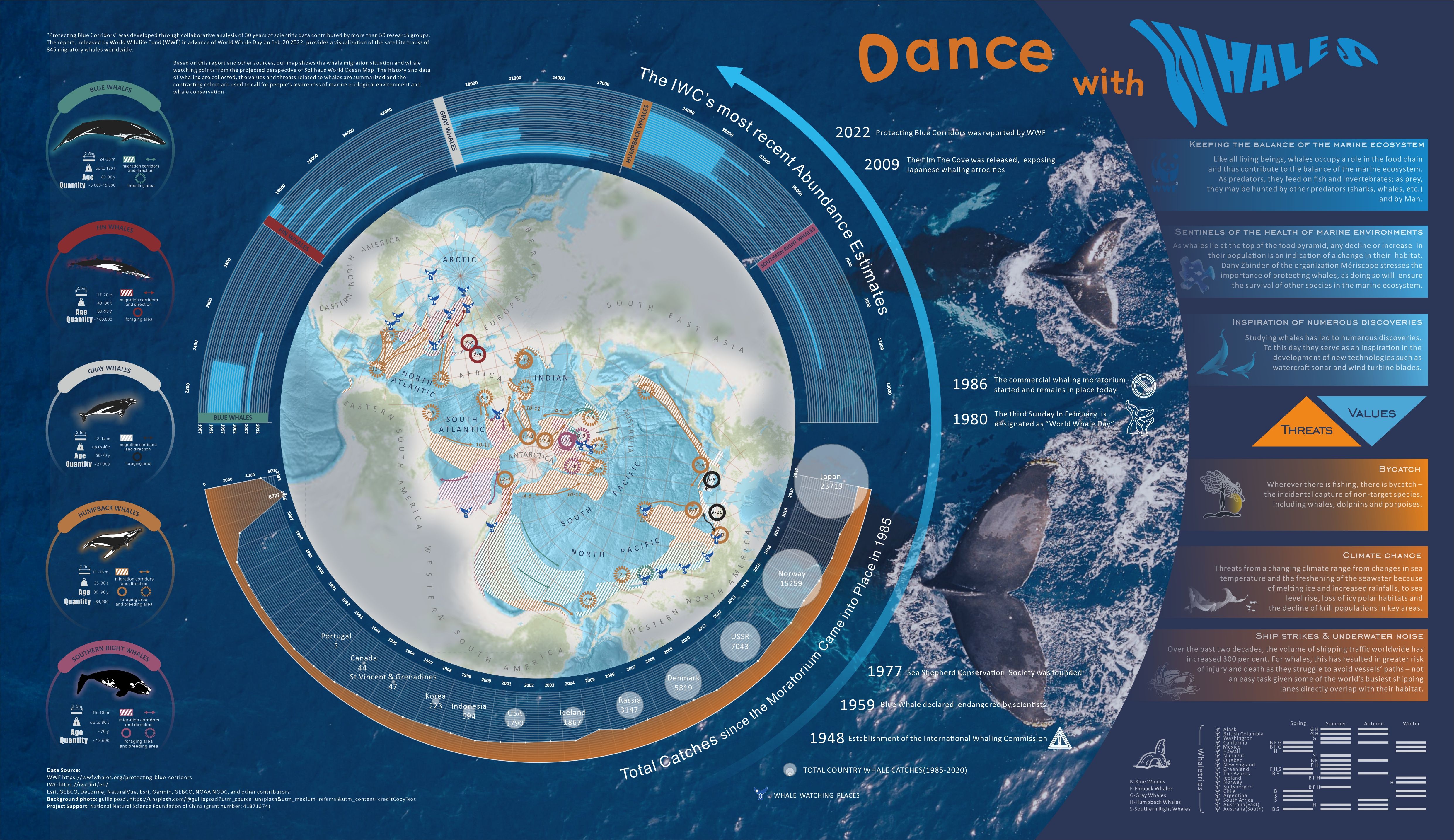 世界自然基金会(WWF)在2022年发布的 Protecting Blue Corridors 报告恰逢其时提供了丰富的资料基础。报告结合30余年50多个研究团队对全球845头迁徙鲸鱼的卫星跟踪数据,展示了世界鲸鱼蓝色走廊的全球分布。