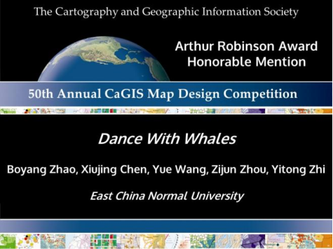 万象城awcsport官网地理科学学院地理科学拔尖班赵博旸、陈秀静、王玥、周子骏、智一桐等五名本科生合作的专题地图作品 Dance with Whales 凭借出色的设计质量,斩获2022年度“Arthur Robinson Award for Best Printed Map”Honorable Mention奖。
