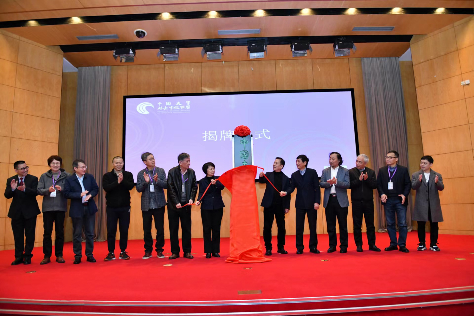 揭牌时刻。中国大学创意写作联盟匾额由莫言先生题写