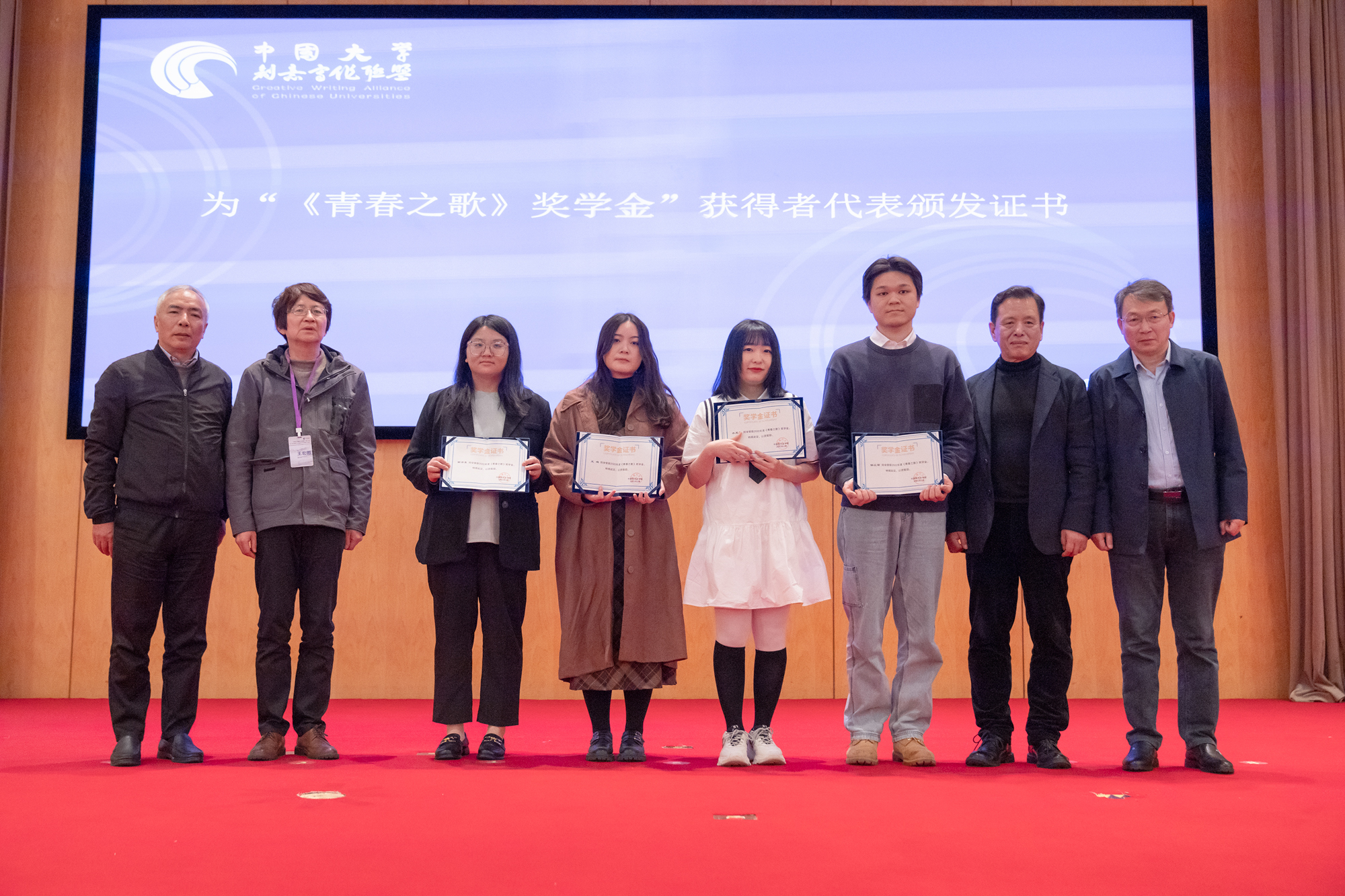 李敬泽、格非、李洱、王宏图四位嘉宾为“《青春之歌》奖学金”获得者代表颁发证书