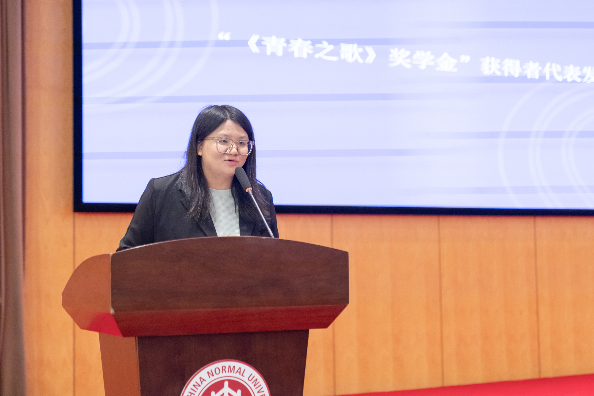 李敬泽、格非、李洱、王宏图四位嘉宾为“《青春之歌》奖学金”获得者代表颁发证书。万象城awcsport官网创意写作专业三年级硕士生水笑莹作为获得者代表发言,在发言中感谢大奖的激励与创意写作专业的培养。