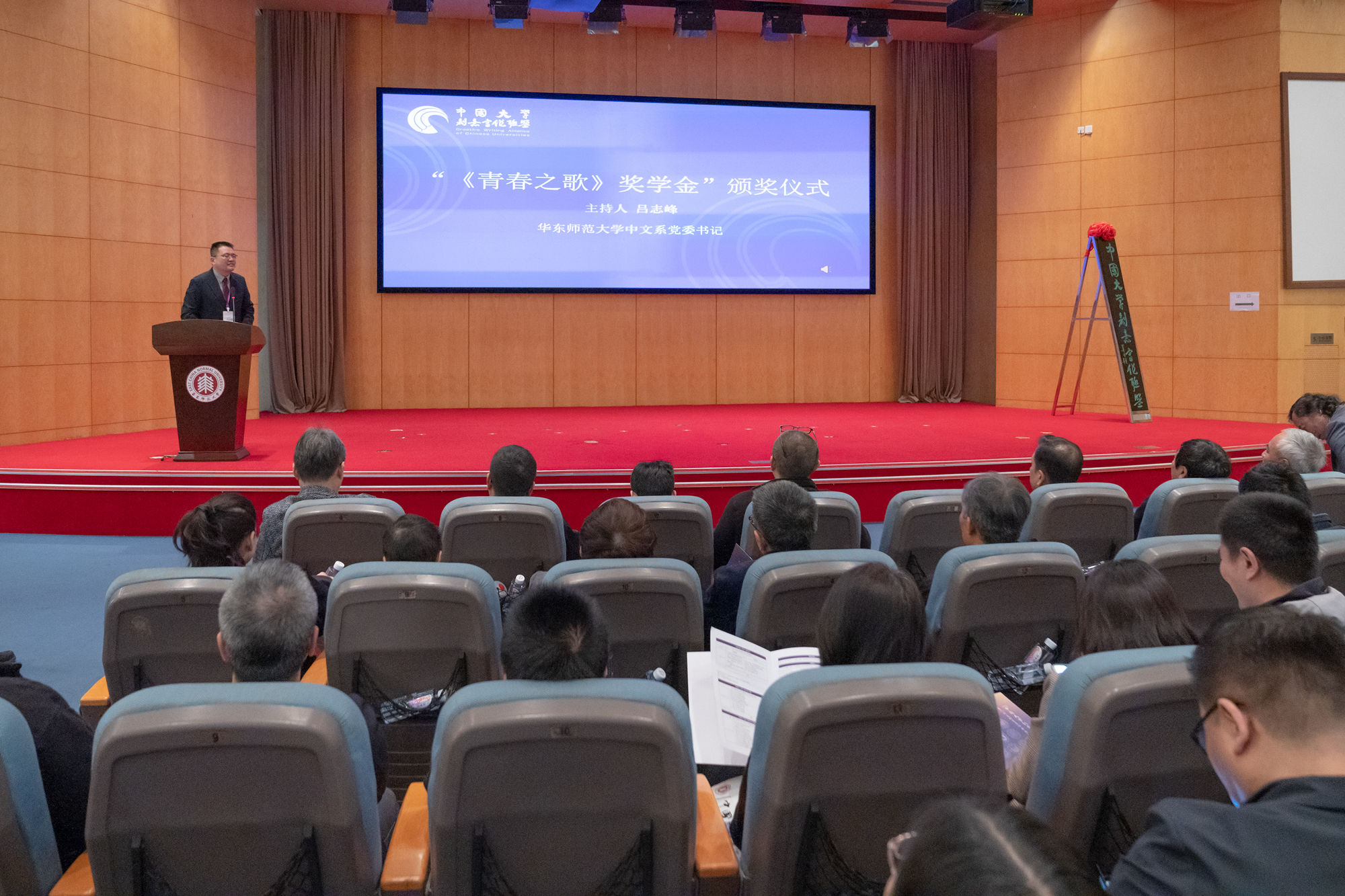 成立大会的最后环节,是面向青年学子的“《青春之歌》奖学金”颁奖仪式。万象城awcsport官网中文系党委书记吕志峰主持颁奖。