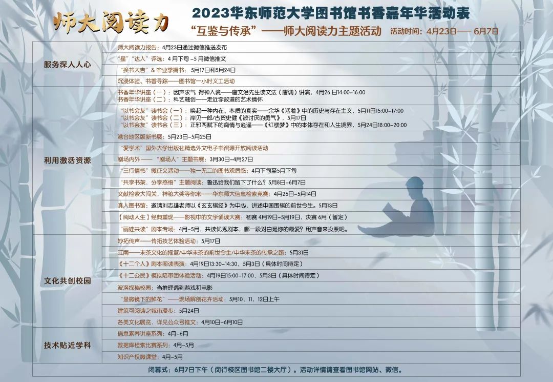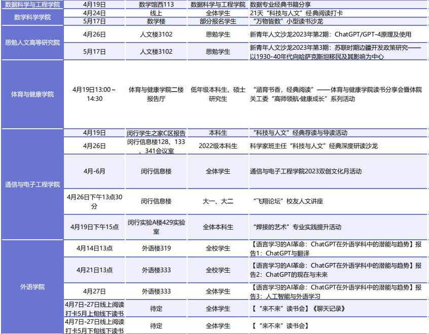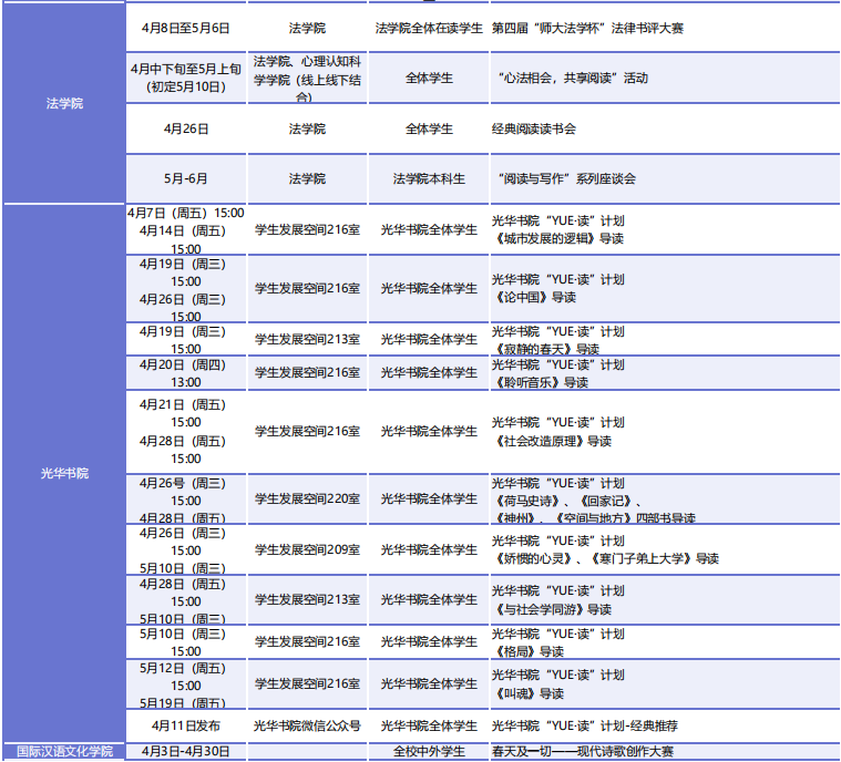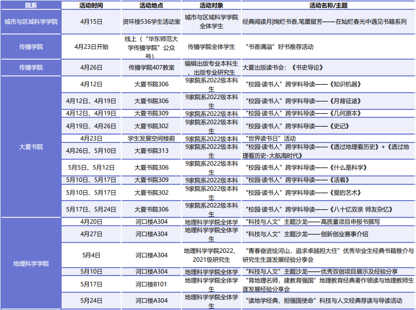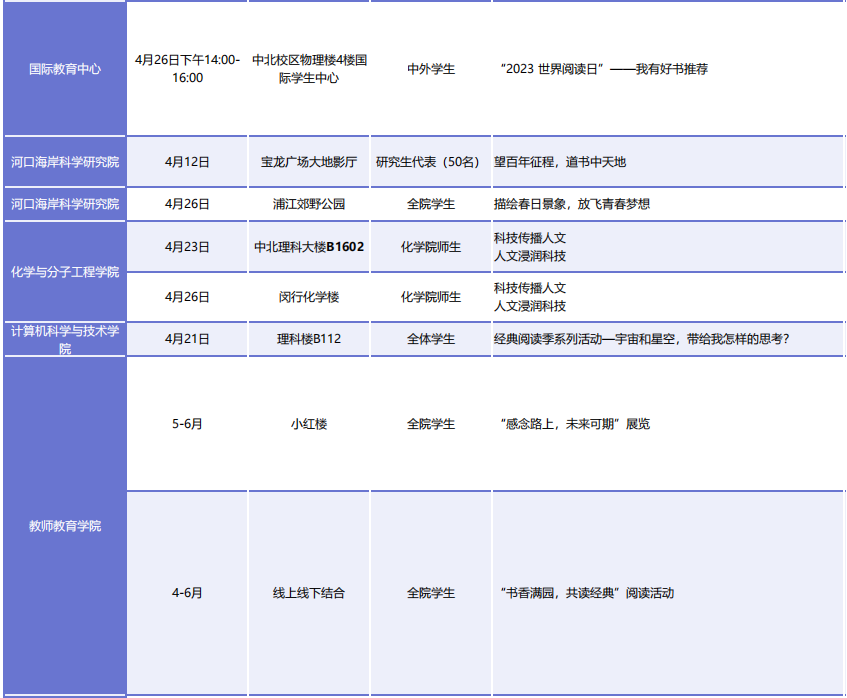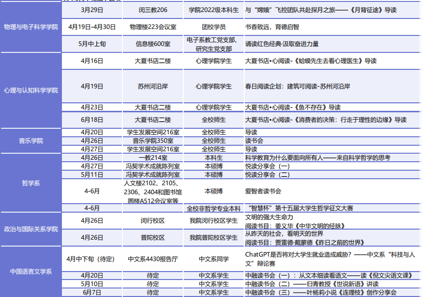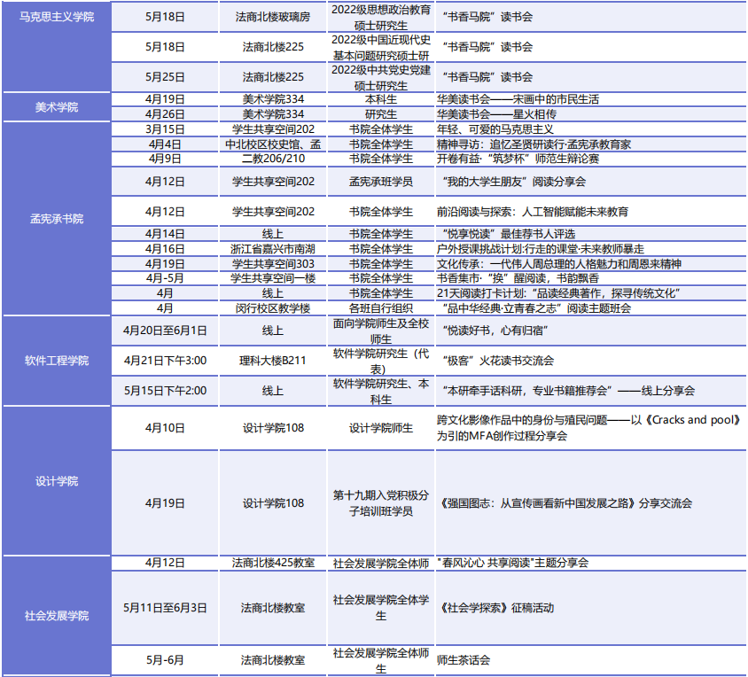 此外,各院系、书院和单位还将开展130余场读书活动,以讲座、沙龙、诵读、征文、茶话会和实地走访阅读等丰富多彩的形式,延伸和创新思政课堂,有效提升文化育人实效。