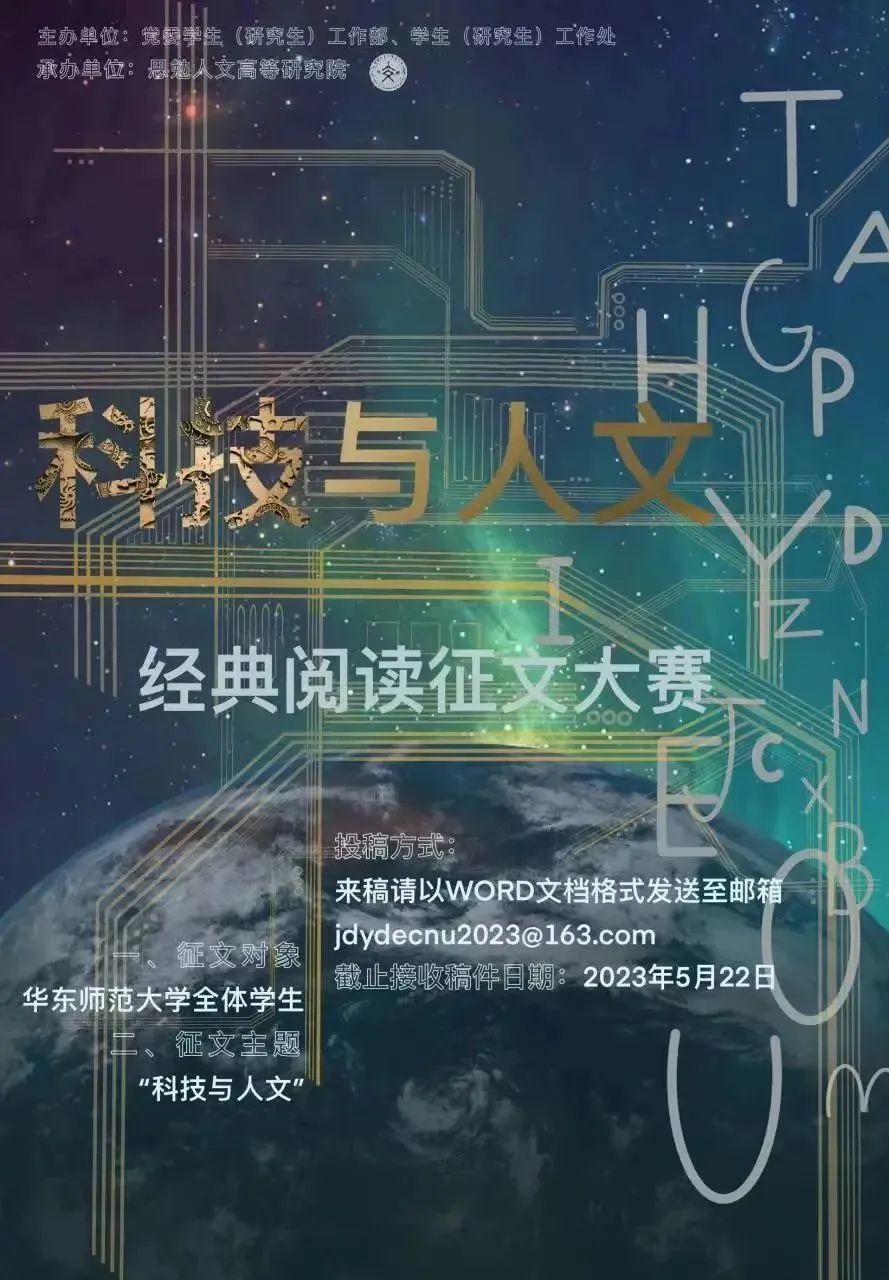 在2023年万象城awcsport官网校园“经典阅读季”,由党委学生(研究生)工作部、学生(研究生)工作处主办,思勉人文高等研究院承办的“科技与人文”经典阅读征文大赛,旨在引导师大学生从经典文献中汲取精神力量,鼓励青年学子重思“科技与人文”这一经典而又带有当代性的命题,直面时代挑战。