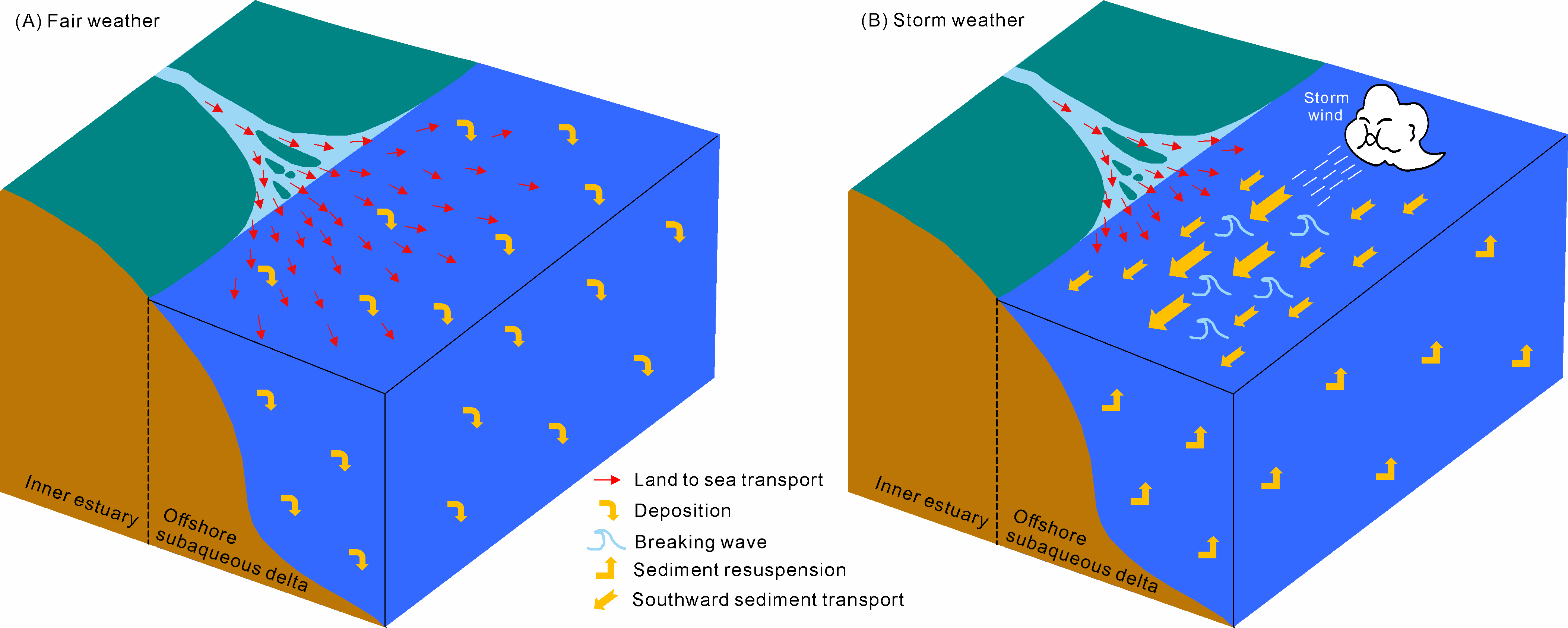简化的风暴和平静天气下长江入海泥沙运移概念模型图