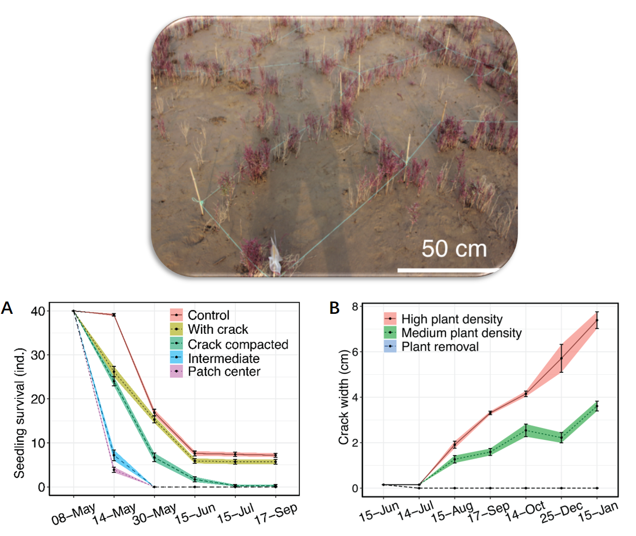研究植物-裂纹相互作用的原位实验。(A)裂纹中碱蓬幼苗可以维持较高的存活率(“Withcrack”);(B)碱蓬植物的存在有助于裂纹的维持。