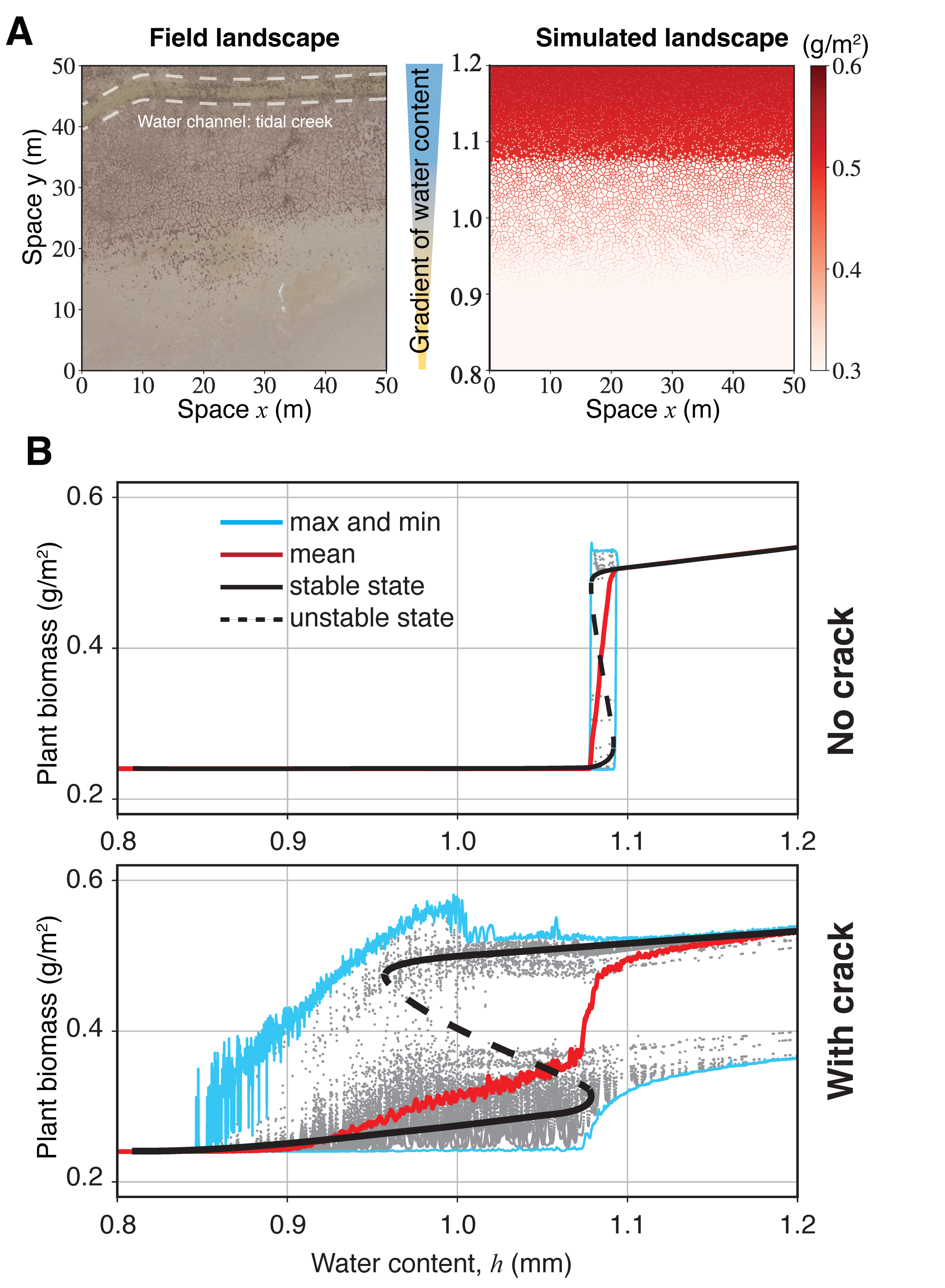 自组织裂缝形成对碱蓬空间分布及其生态系恢复力的影响。(A)无人机影像和数学模型展示了沿着土壤含水量的空间梯度的植被空间格局变化,从植被密集分布到多边形分布再到稀疏分布。(B)在不存在自组织裂缝的情况下,随着环境含水量压力参数的变化,模型生态系统呈现出一个略微滞后狭窄的临界区间。然而,自组织裂缝导致生态系统崩溃的临界点显著延迟,环境应力阈值更低,滞后范围更广。黑色实线和虚线分别表示稳定状态和不稳定状态的位置,物理自组织裂纹可能会显著规避临界点。