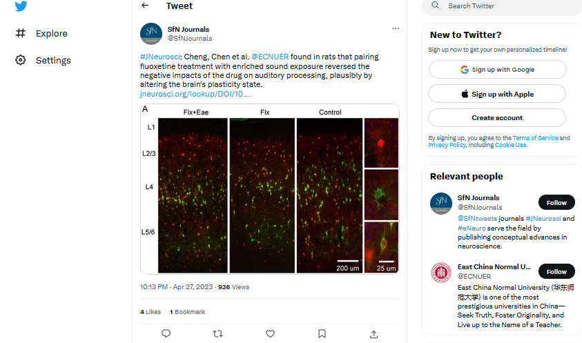 万象城awcsport官网生命科学学院、脑功能基因组学教育部重点实验室周晓明教授团队4月19日发表在神经科学顶级期刊《Journal of Neuroscience》上的研究论文 Pairing with enriched sound exposure restores auditory processing degraded by an antidepressant 表明,慢性氟西汀暴露诱发成年大鼠听觉分辨行为及脑听皮层神经元声调谐特性异常。而氟西汀用药结合丰富声暴露可以改善药物对听觉的影响,这种变化可能与药物引致的脑抑制性状态改变有关。这些发现对理解抗抑郁药物影响听觉的中枢机制有重要意义,同时提示将抗抑郁药治疗与丰富的感觉刺激相结合可以优化临床效果。该论文被评为亮点研究(Featured Research),并由神经科学学会(Society for Neuroscience)发布在Twitter,Facebook以及LinkedIn等平台进行宣传和交流。
