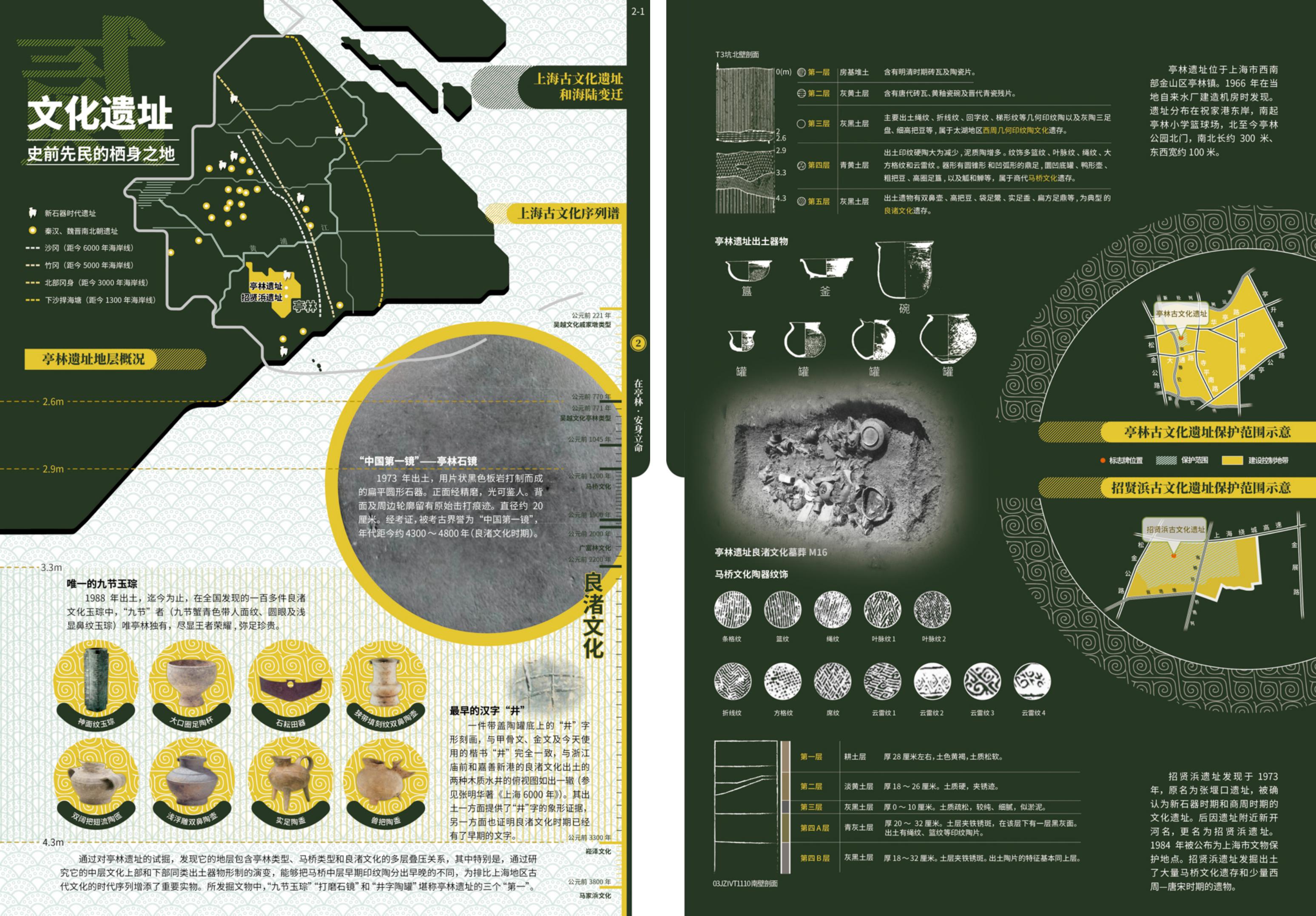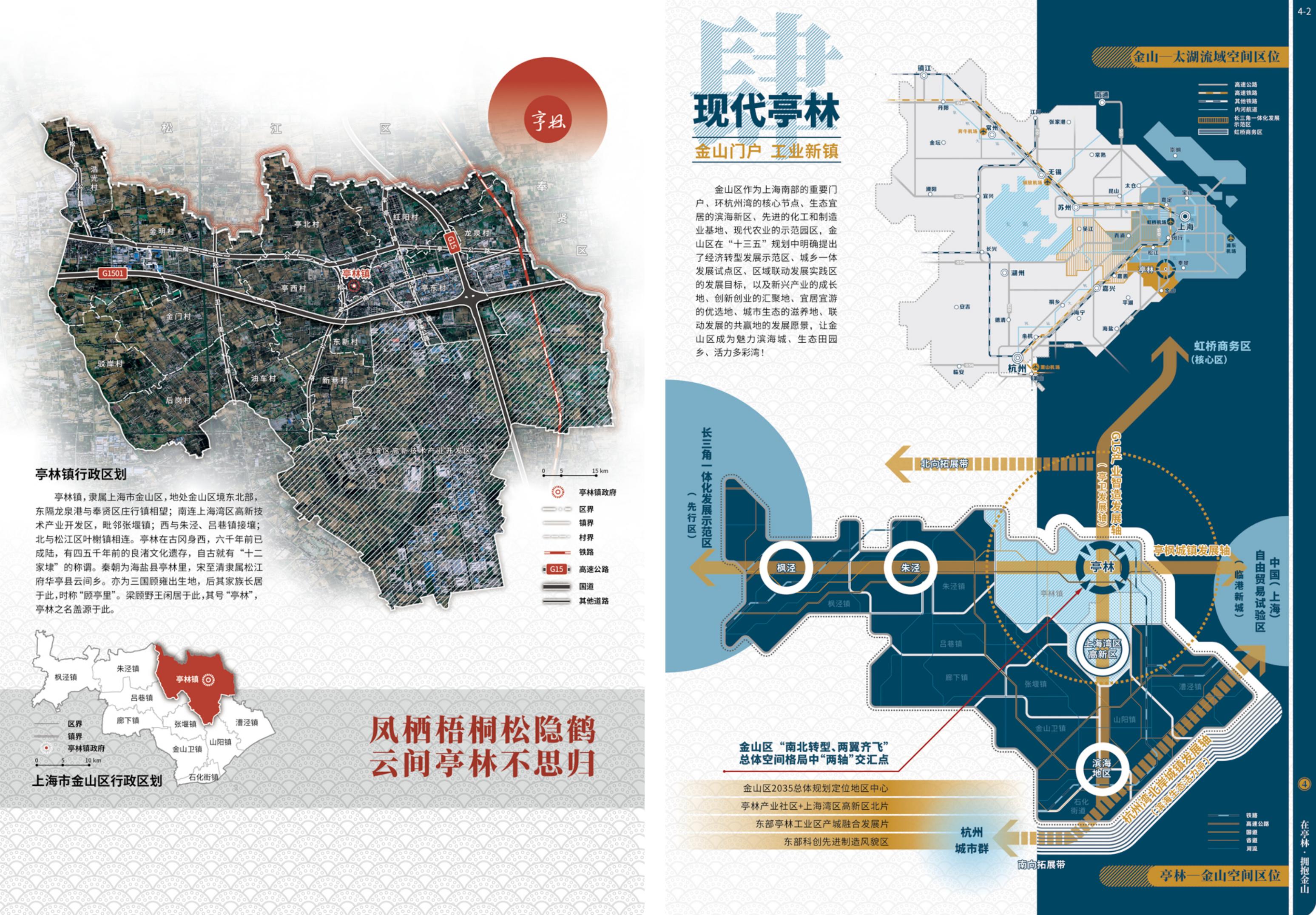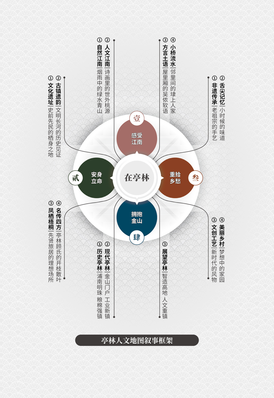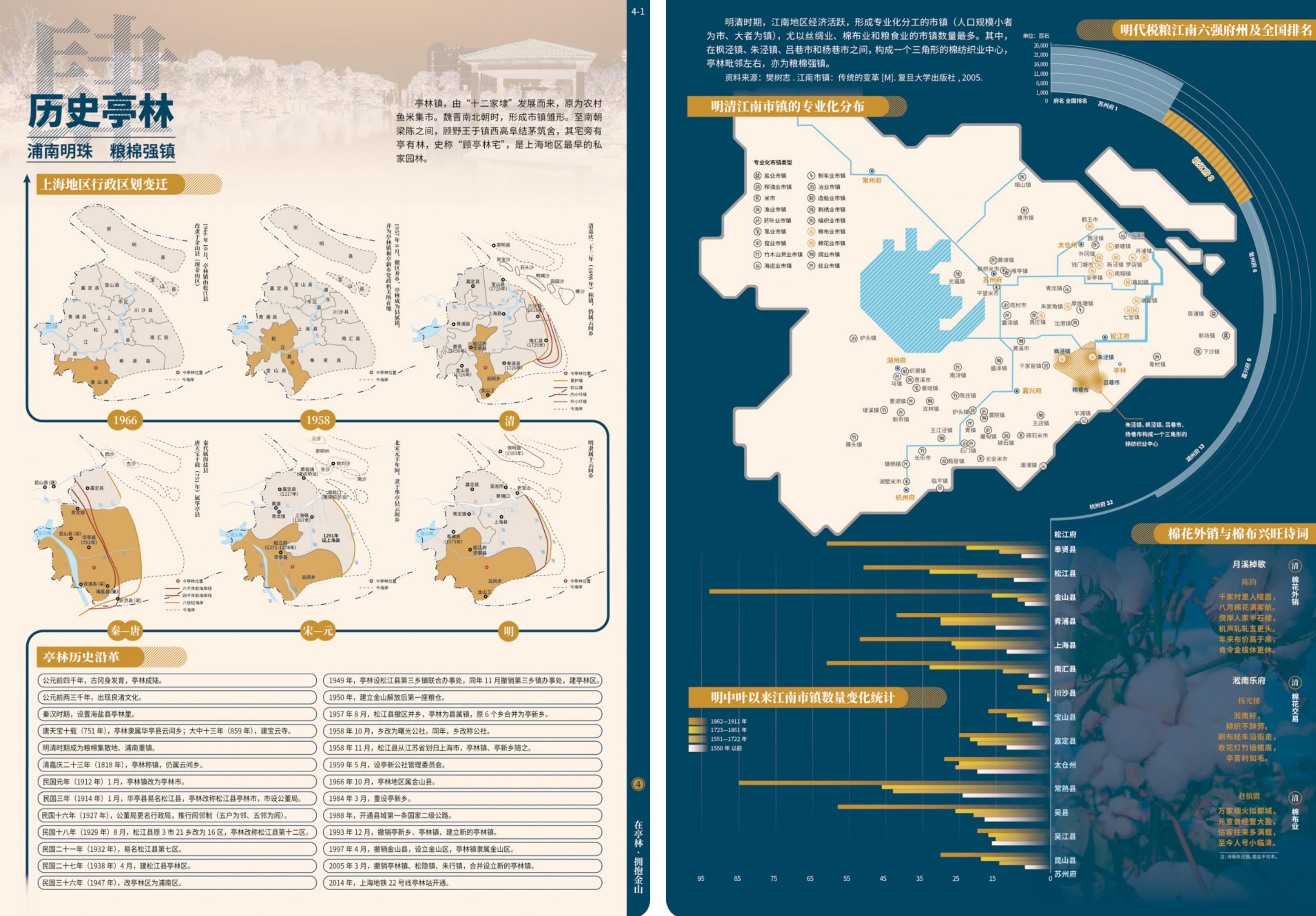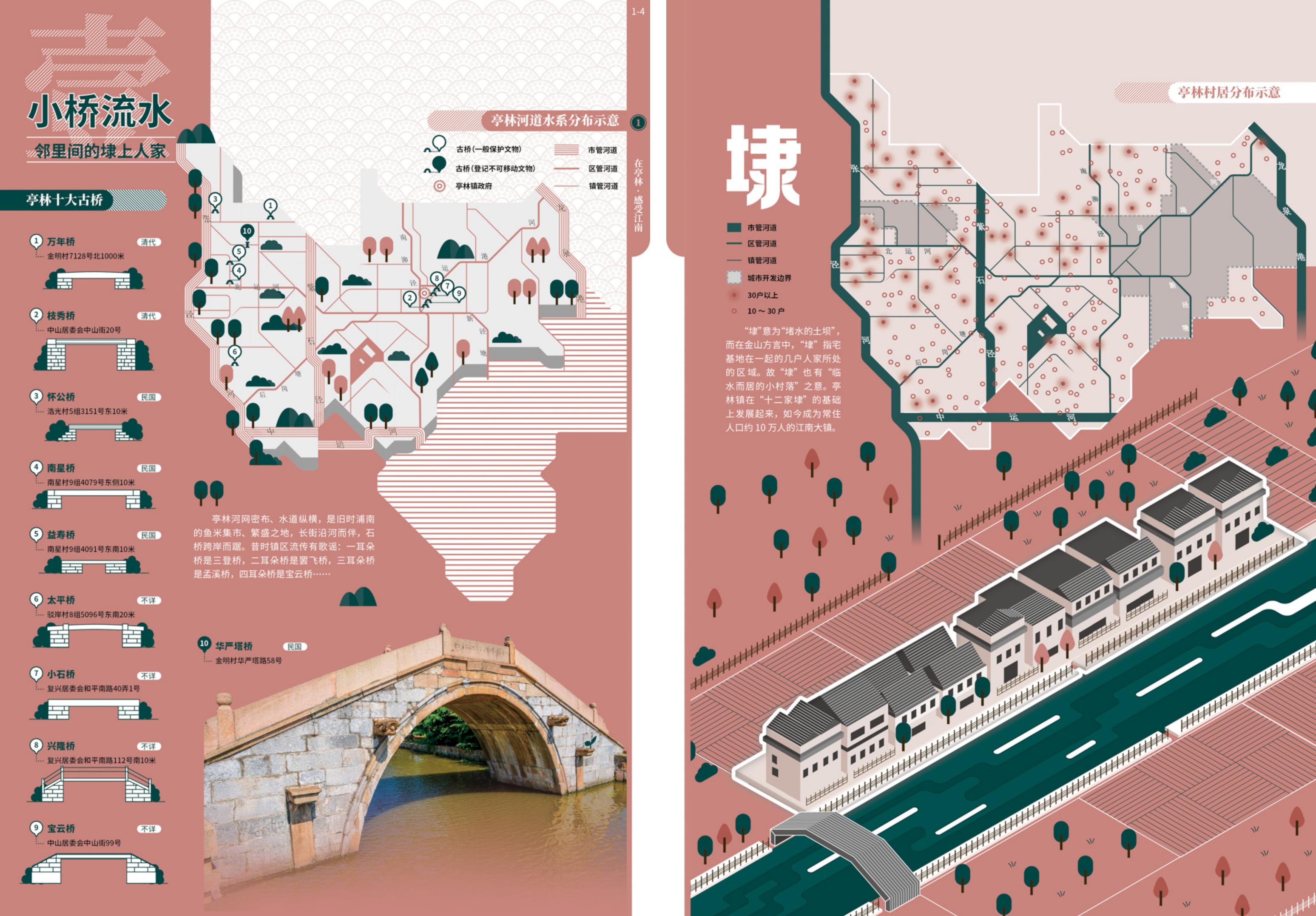 在大纲框架的设计中,《亭林人文地图》以“凤栖梧桐松隐鹤·云间亭林不思归”为隐喻主旨,构建“感受江南”“安身立命”“重拾乡愁”“拥抱金山”等4个图组的叙事线索,以15个图幅30个页面的专题时空信息图示,渐进式、系统性地解说亭林“自然优渥(禀赋)—人文昌盛(历史)—乡愁浓郁(传承)—城镇繁荣(发展)”的内在逻辑,清晰阐释了亭林镇宜居宜业的江南自然人文背景、丰厚的历史文化遗存和影响,以及优越的产业基础和区位优势。