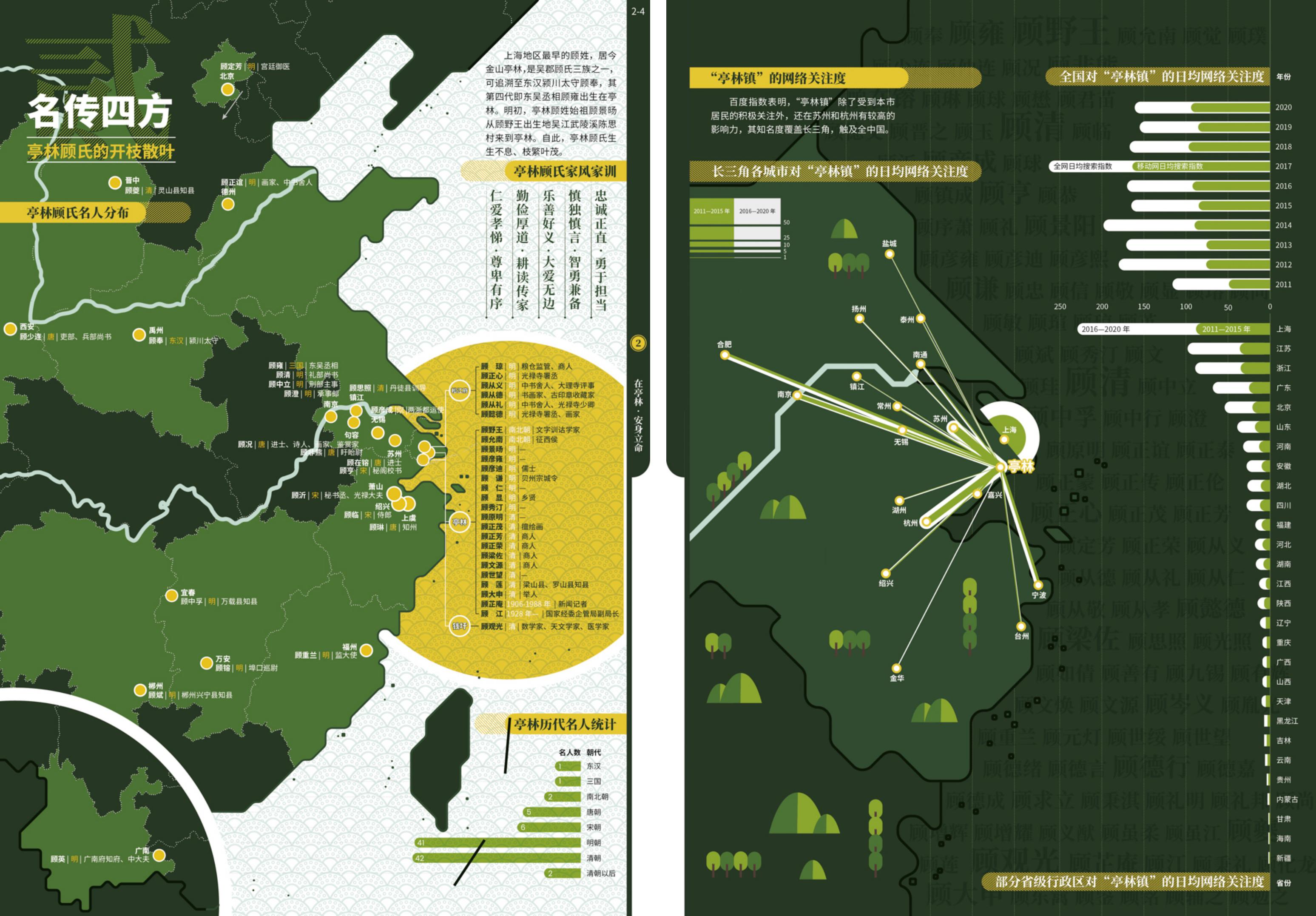 图组2“在亭林·安身立命”:通过文化遗址、古镇遗韵、凤栖梧桐、名传四方等4个图幅,“由古及今”地呈现亭林适宜人居的遗存见证、代表人物和后世影响。与图组1“地”的主题相对应,图组2更紧扣“人”的故事。其中,“名传四方:亭林顾氏的开枝散叶”图幅通过族谱文献资料与互联网大数据相结合的挖掘整理,在全国、长三角两个尺度将先人历史的全景版图与今人当下的网络关注格局关联起来,详实重现了吴郡顾氏三族之一的亭林顾氏——从东汉颍川太守顾奉、东吴丞相顾雍到南朝地理学家、文字训诂学家、史学家顾野王并及后世名人——生生不息的家族空间图谱。图组2整体借“春风又绿江南岸,明月何时照我还”的黄绿配色方案,充分彰显了文脉绵延的生命力意象。