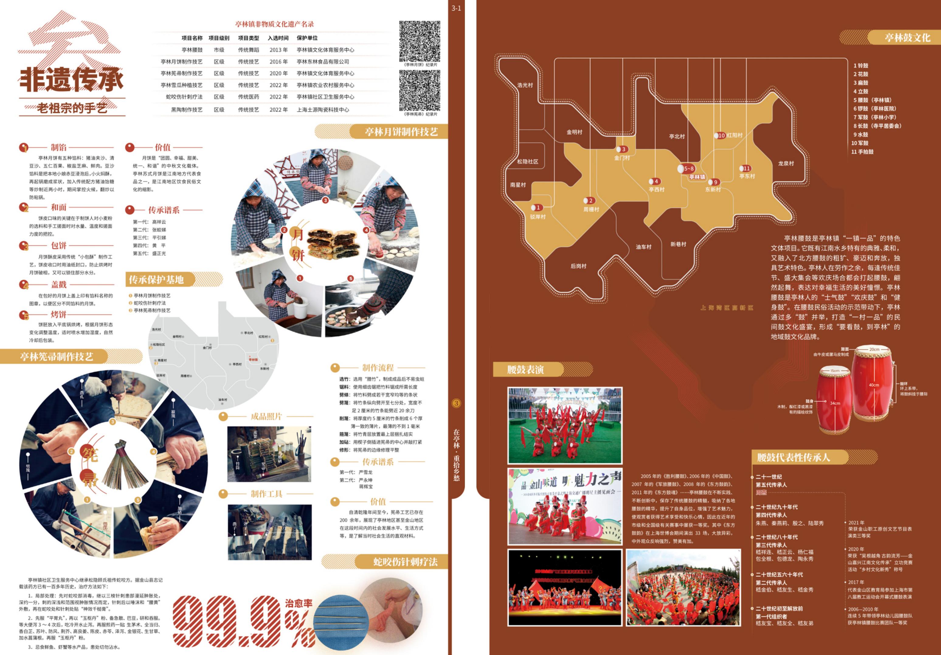 图组3“在亭林·重拾乡愁”通过非遗传承、舌尖记忆、文创工艺、美丽乡村等4个图幅,“以小见大”地呈现亭林生活积淀的精湛技艺、传统美食和乡韵乡愁。这一篇章的内容是文旅类导览产品着重落笔的经典版块,与地方文旅资源禀赋关系密切,最适宜呈现在地文化的“烟火气”;但囿于素材自身的非空间性,在地图上如何呈现成为挑战。在诸如“非遗传承:老祖宗的手艺”等图幅设计中,给予地图以配角角色,或作为非遗手艺传承保护基地的坐标索引,或作为“一村一品”等区域特色比较的定位参照;同时,通过边界消解、形态和尺寸的灵活调节,合理达成与多元非地图图解的融合构图方式。图组3设色取“落红不是无情物, 化作春泥更护花”的红泥暖调,更添一份古典温厚、守正开新的传承意象。