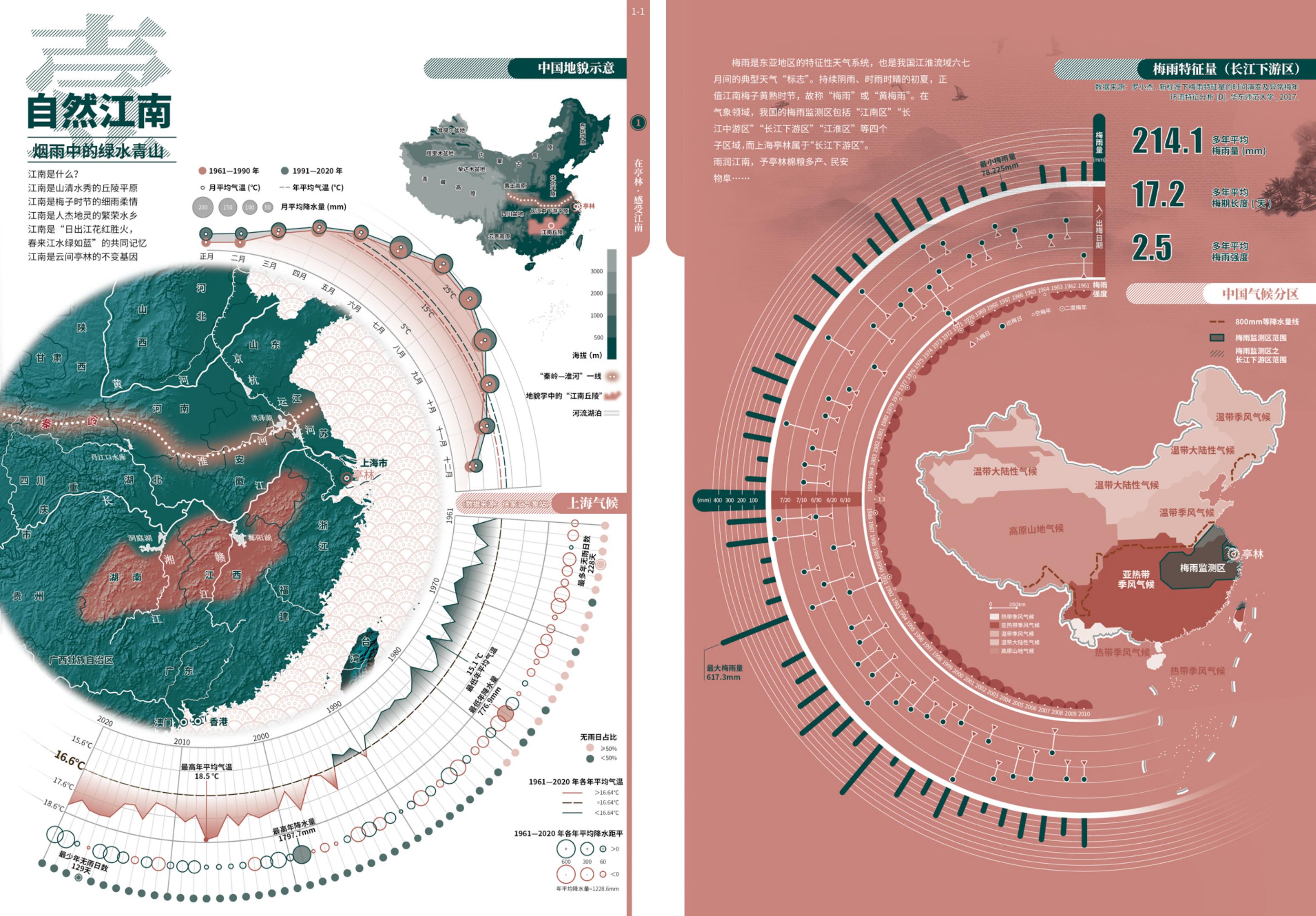 图组1“在亭林·感受江南”:通过自然江南、人文江南、方言土语、小桥流水等4个图幅,“自下而上”地呈现亭林江南文化的自然基础、历史底蕴和典型景观。当下文旅类媒体产品的打造,除了满足娱乐、游憩属性,还需承担知识供给的角色。如在“自然江南:烟雨中的绿水青山”图幅设计中,即充分兼容地貌、气候区划地图与多元气候数据统计图表,尤其将江南自然印象中的典型梅雨特征量进行特写,数据指标多样,知识层次丰富。同时,图组1整体嵌入“日出江花红胜火,春来江水绿如蓝”的“绿映红”设色,在宏微相接的尺度空间变换中铺垫出亭林背后的自然与人文底色。