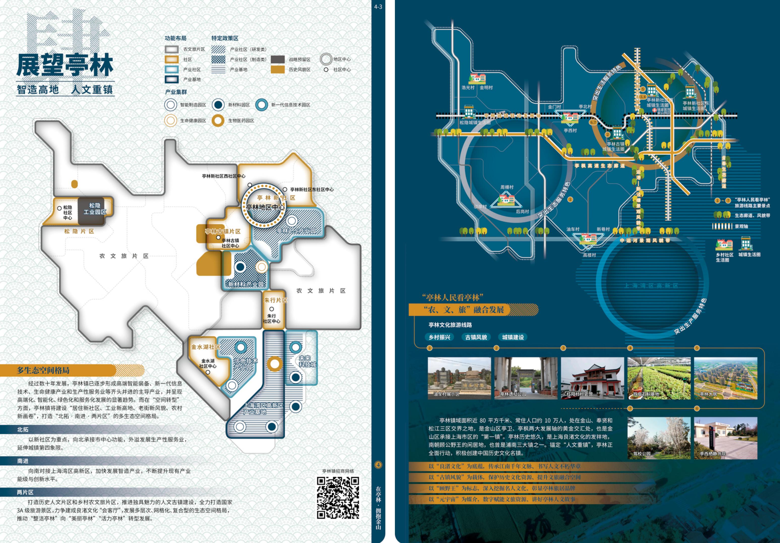 图组4“在亭林·拥抱金山”通过历史亭林、现代亭林和展望亭林等3个图幅,“古今辉映”地呈现亭林勇毅前行的过去、现在和未来。传承是为了更好的发展,历史的回望则是进一步清晰规划发展的新路径。在“展望亭林:智造高地 人文重镇”图幅,采用八方位拓扑化边界综合和非数据驱动的“类地图”表达策略,在镇域全局尺度精要地呈现区域“生态—生产—生活”三生融合及“农—文—旅”城乡统筹的空间战略概念格局。图组4作为图集的尾图部分,目标着眼发展蓝图,即以“物有无穷好,蓝青又出青”为配色基调,契合亭林未来无限可能的递进迭代愿景。