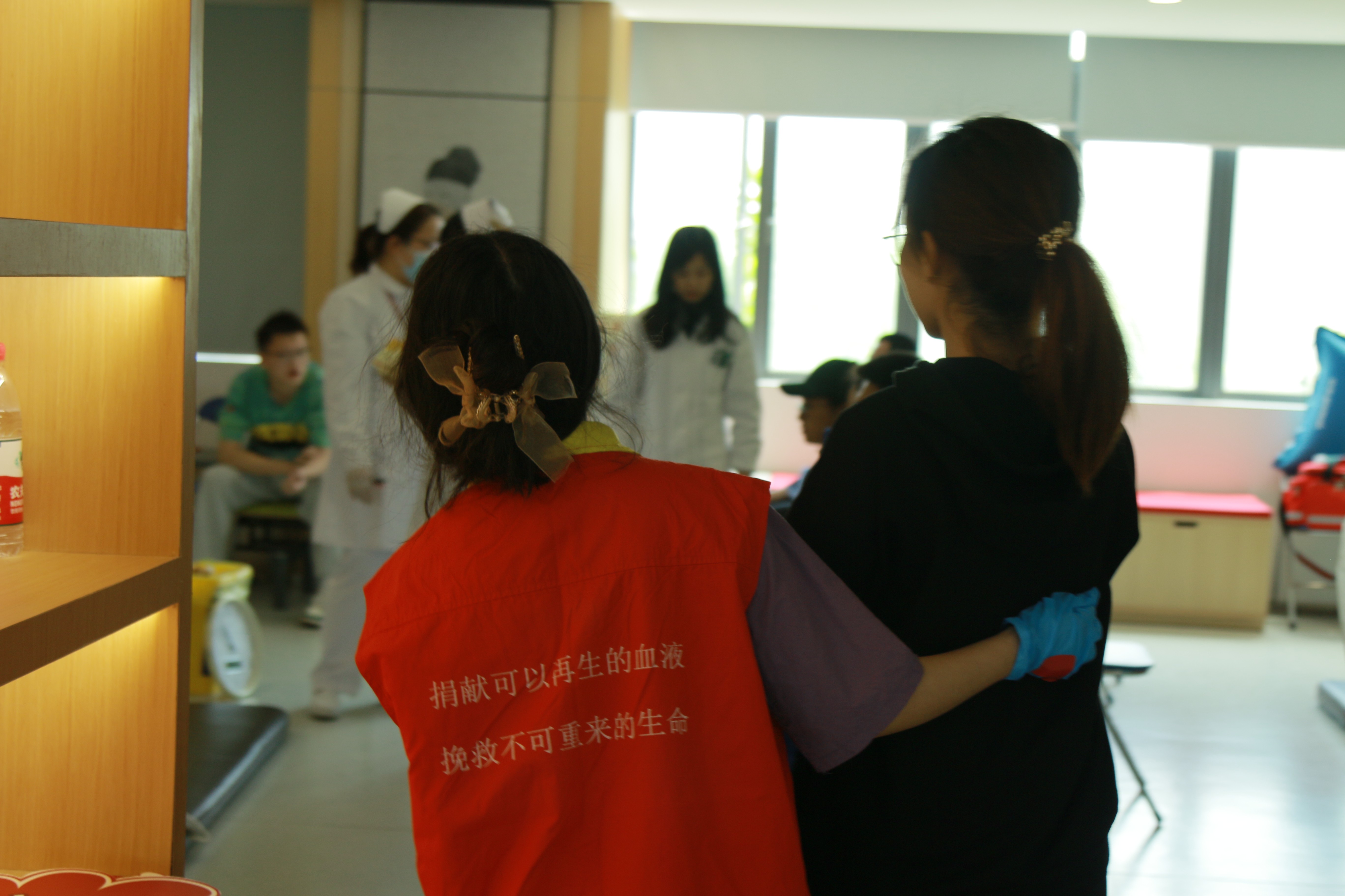 校医院的医务人员和志愿者们,热心为师生们介绍献血流程,叮嘱献血注意事项、贴心端送红糖水;耐心安抚献血前紧张的同学;帮献血的同学拿东西并护送到休息区,将汗水融化成满脸笑容,温暖了前来的每一位献血者。