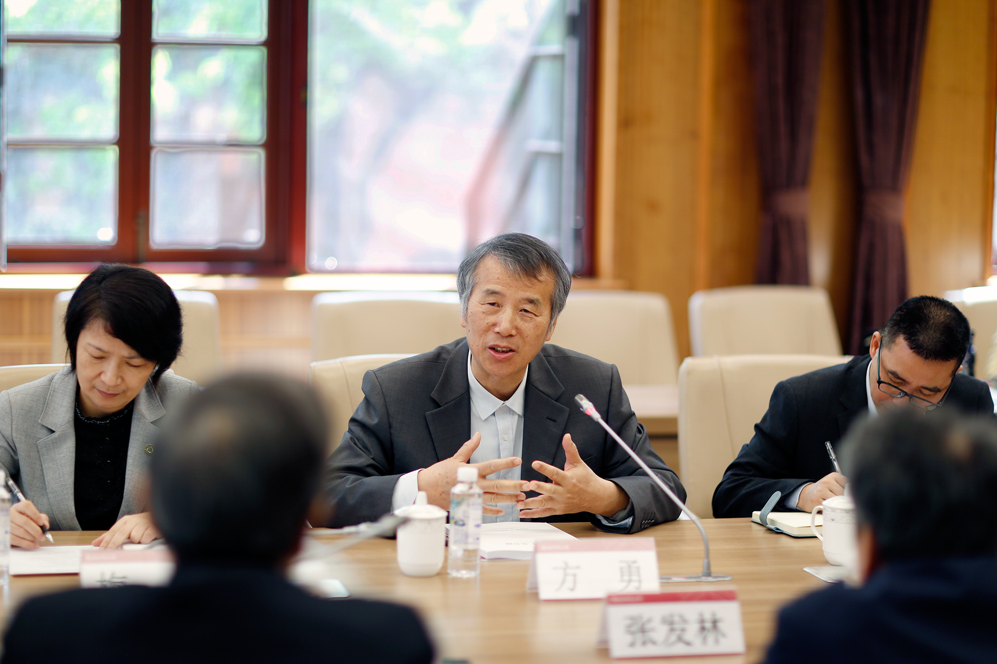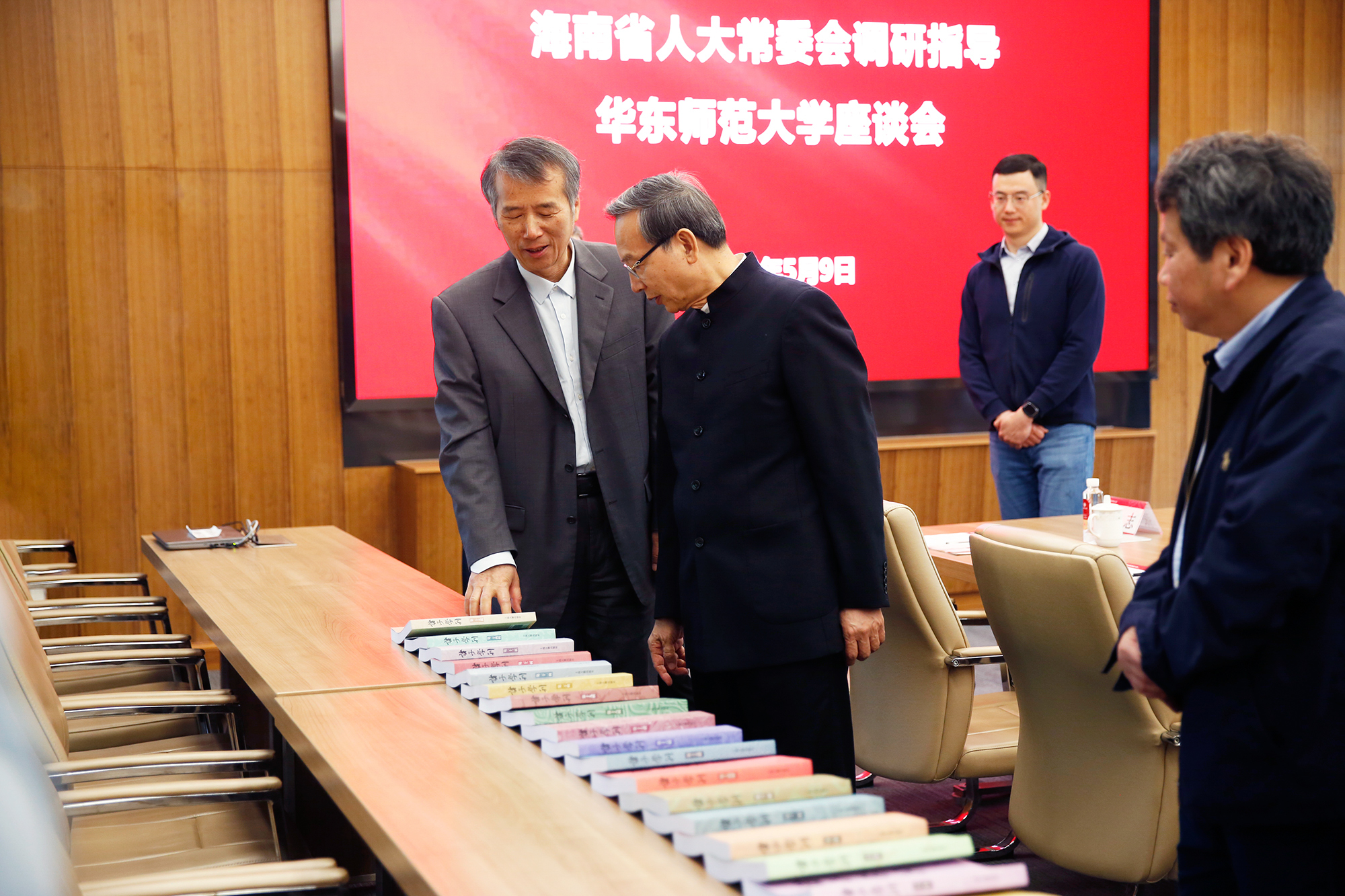 海南省人大常委会选举任免联络室主任符兴勇,武汉大学社科院副院长张发林、《民藏》编辑部副主任谢远笋,海南大学人文学院副教授马荣江,海南师范大学文学院副教授孙刚等参加调研。我校党委统战部部长、学校办公室主任张惠虹,档案馆馆长汤涛,中国语言文学系系主任文贵良、副研究员方达,人文与社会科学研究院副院长费斌出席会议。