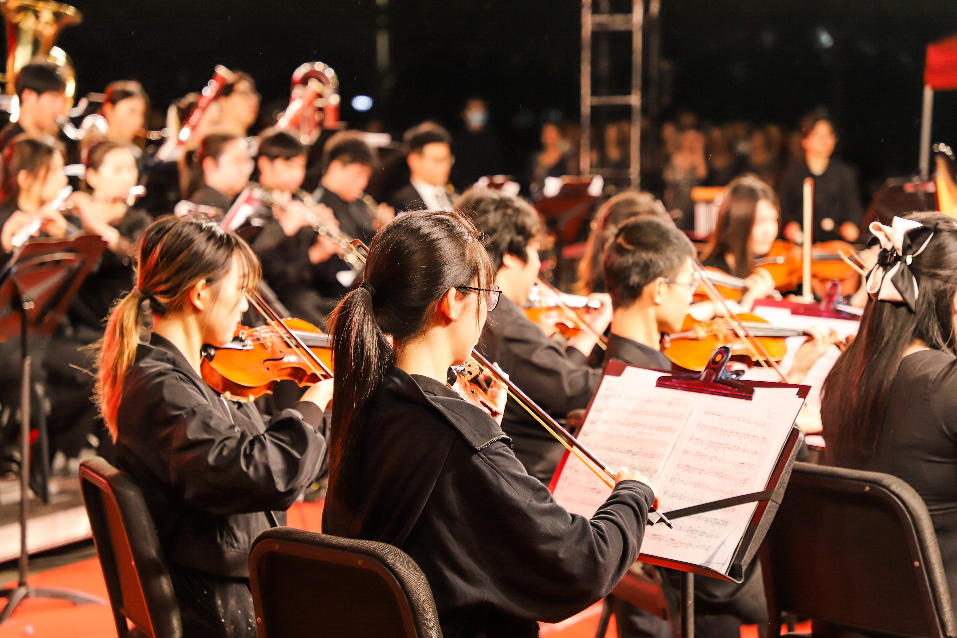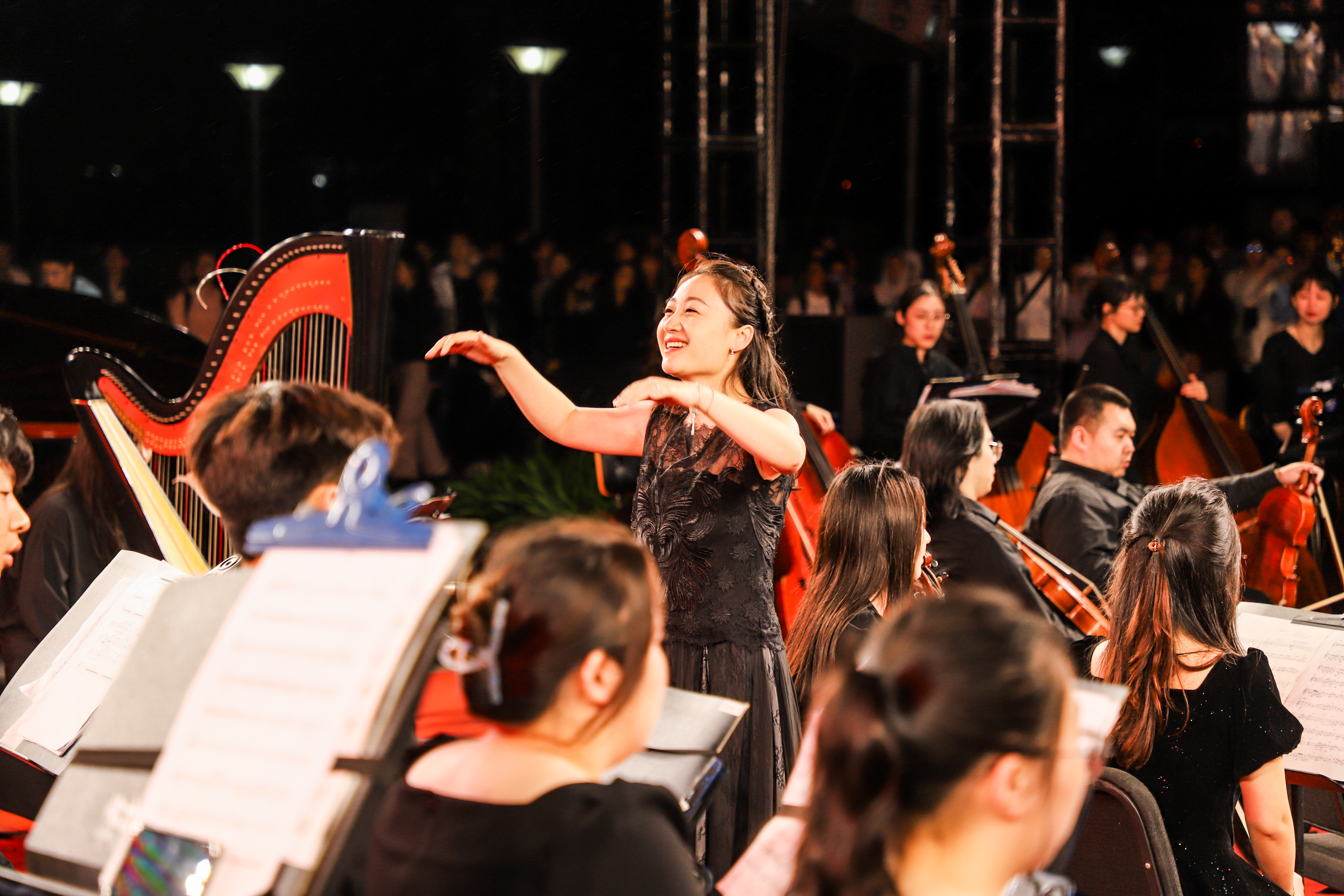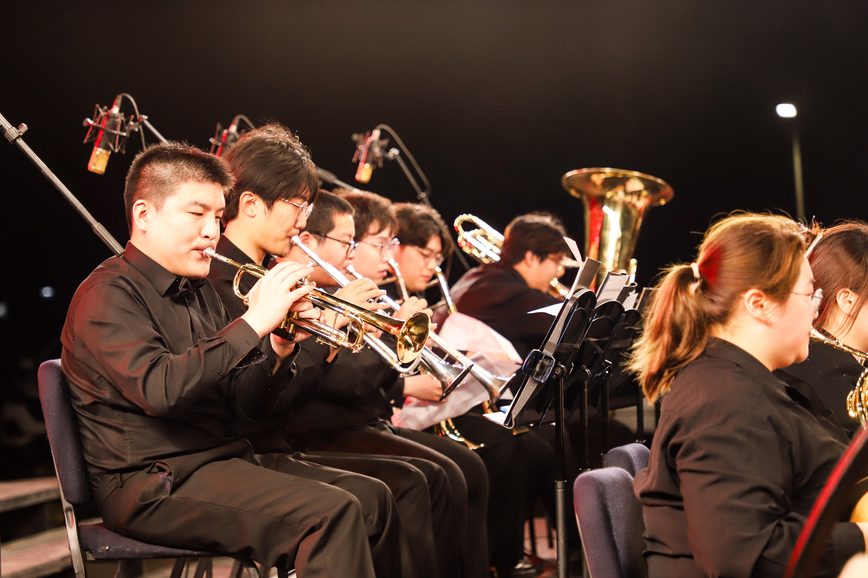 在音乐会的尾声,一首首荡气回肠、蕴含着深刻情感的爱国主义作品在校园里奏响,《我的祖国》《红色娘子军组曲》《亮剑组曲》《追寻》带领全场观众共同追寻红色记忆、感悟红色精神、汲取红色力量。在酣畅淋漓的演奏之中,音乐盛宴落下帷幕。