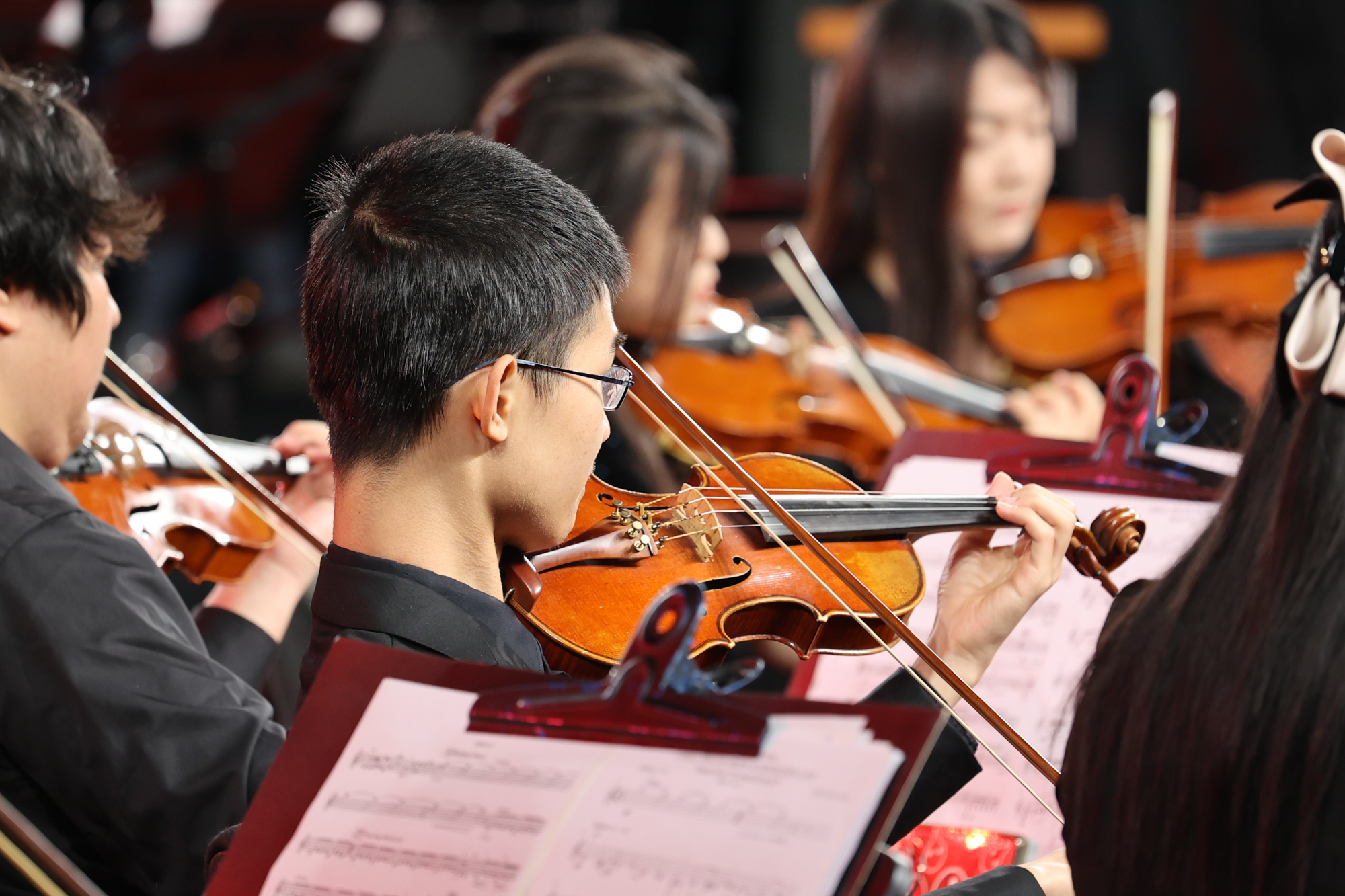 演出现场,交响乐团在张锐教授的指挥下,曲子时而高亢激昂、气势恢宏,时而宁静优美、宛转悠扬,仿佛一首交响诗。