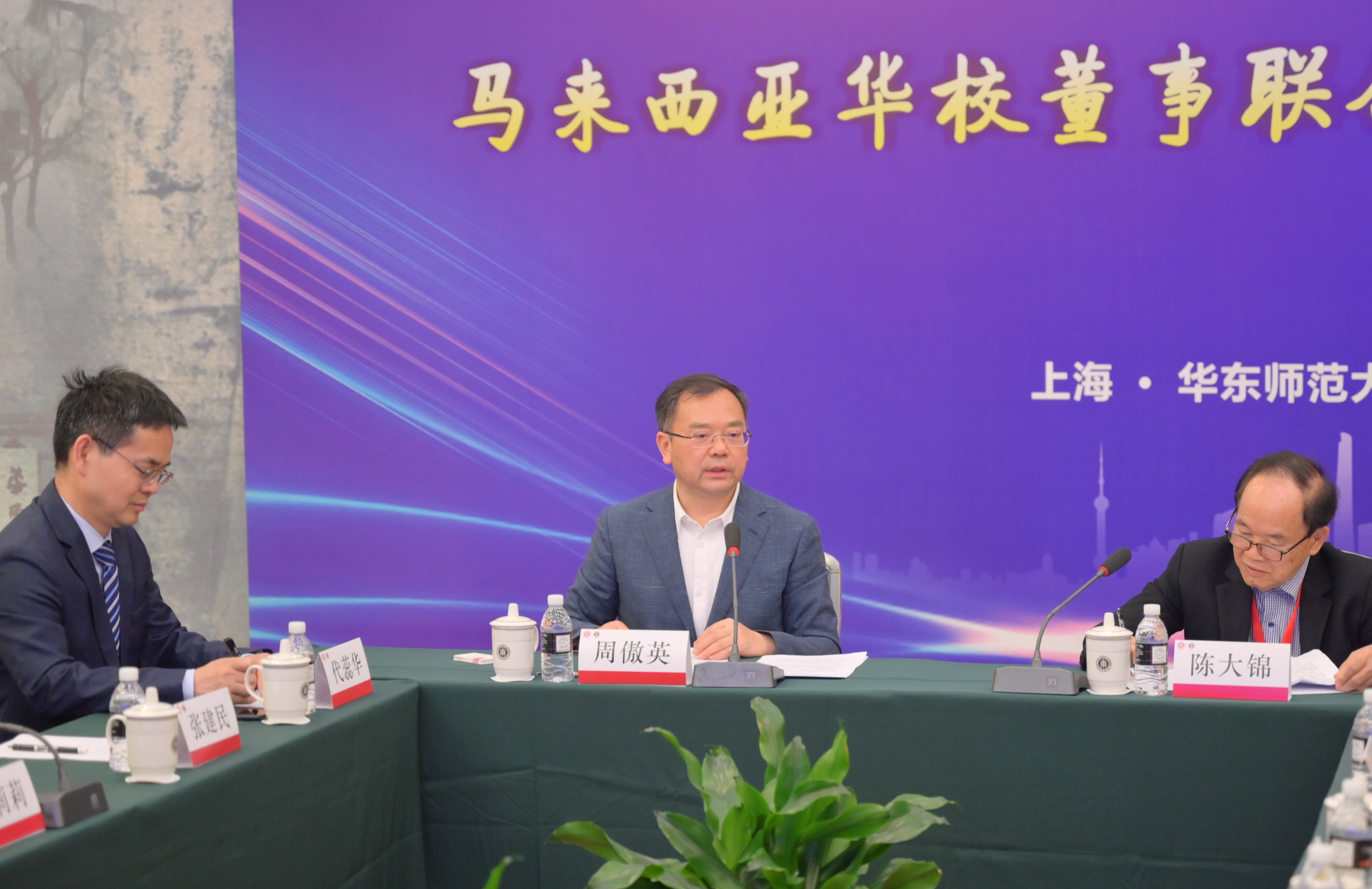 5月25日下午,华东师大副校长周傲英会见了来访的马来西亚华校董事联合会总会陈大锦主席、陈友信署理主席等一行15人,教育部中学校长培训中心主任代蕊华等陪同会见。