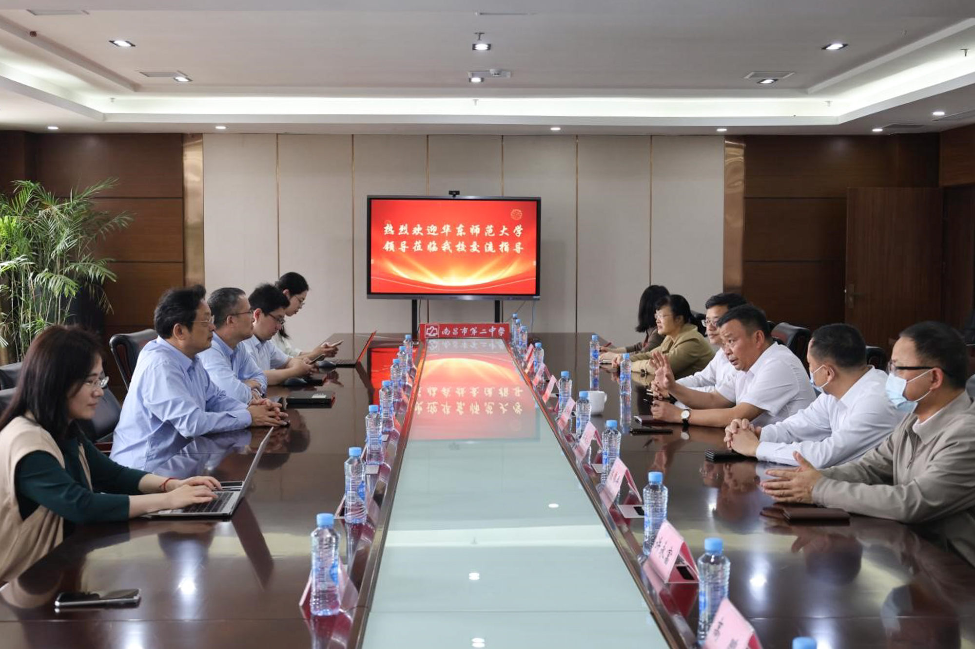在南昌二中,南昌市委教育工委委员、南昌市第二中学校长蔡爱民,南昌市第二中学校党委委员、副校长黄欣荣、符长全、占志斌,教师代表及华东师大校友代表出席会议。蔡爱民给予了华东师大毕业生高度赞许,他表示,华东师大的毕业生成长快,陆续成为了学校的骨干,期待能与学校加强共建,做好实习实践等相关协同。施国跃表示,希望在优质生源基地的基础上,加强实习、就业、教师培训等方面的联动,形成一体化的基地,更好密切联系、形成良性循环。