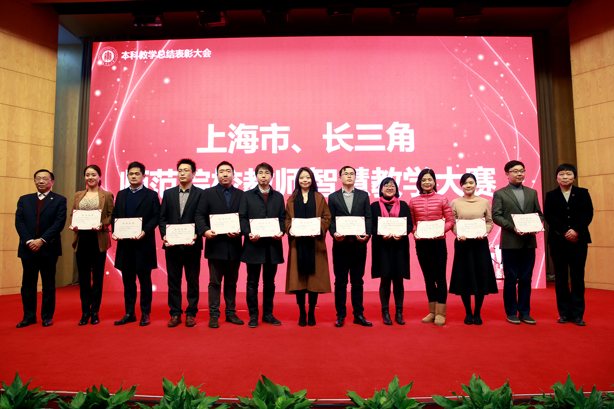 在上海市和长三角师范院校教师智慧教学大赛中,人文社科类,思勉人文高等研究院许可荣获上海市一等奖、长三角二等奖,教育学部张婕荣获上海市二等奖、长三角二等奖,马克思主义学院叶方兴荣获上海市三等奖;理工类,教育学部占小红荣获上海市一等奖、长三角一等奖,教育学部冷静荣获上海市二等奖、长三角三等奖,化学与分子工程学院李德增荣获上海市二等奖、长三角三等奖;艺术类,美术学院陈明园荣获上海市二等奖、美术学院徐英杰荣获上海市三等奖、美术学院丁阳荣获上海市三等奖;体育类,体育与健康学院周婷荣获上海市一等奖、长三角二等奖,体育与健康学院孙朋荣获上海市二等奖、长三角一等奖,体育与健康学院张中印荣获上海市二等奖。校党委副书记杨昌利与校党委副书记曹友谊共同为获奖教师颁奖。