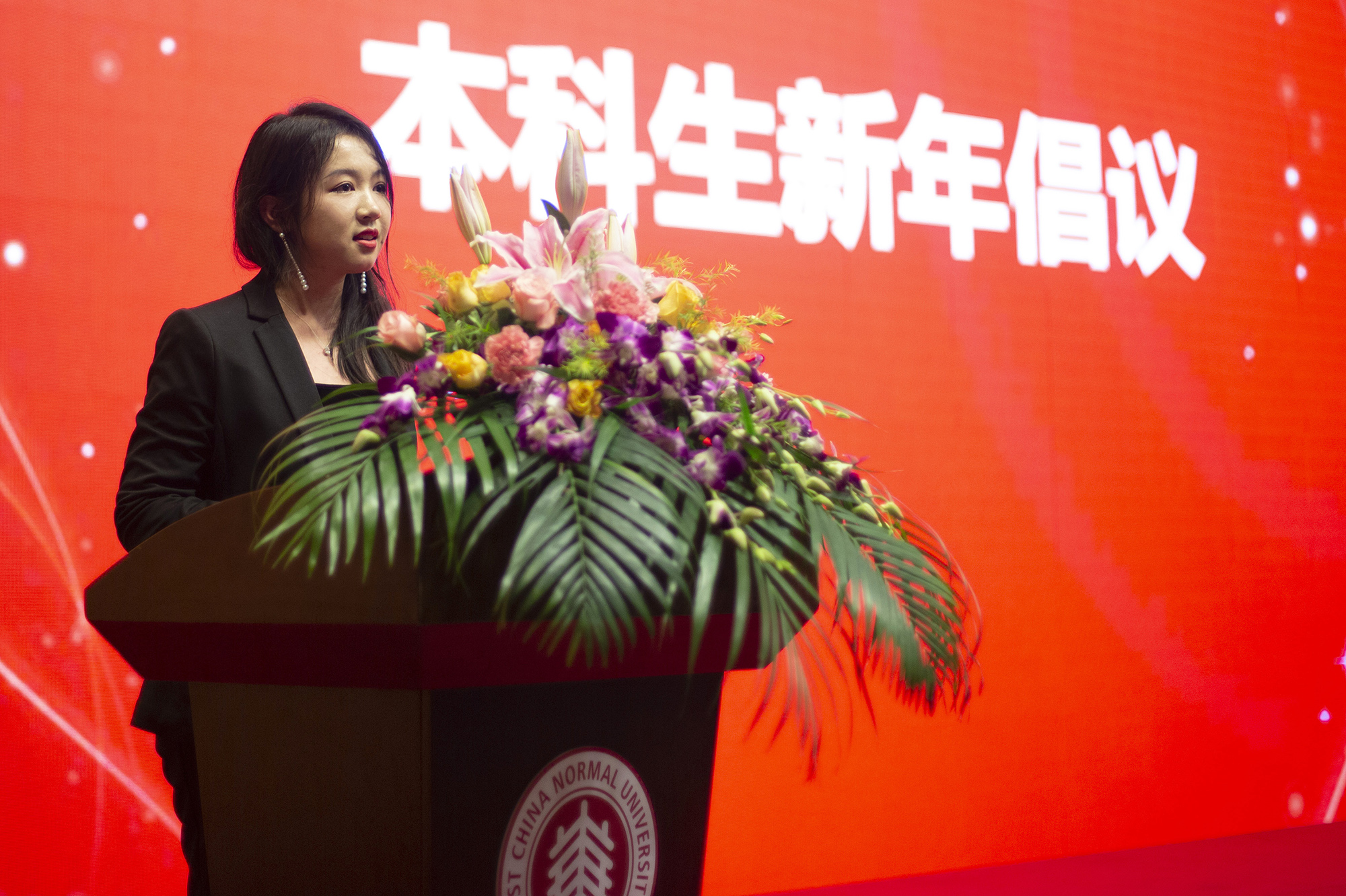 大会最后,2018级法学院王嫣同学向全校本科生发出新年倡议。她感谢了学校和学院为本科生开展学科竞赛提供的优质师资、平台和资源,在英语学科竞赛中心的演讲工作坊中她找到了表达自己勇气和自信的起点。她号召同学们在新的一年整装待发、再创佳绩,向世界展示中国青年的思考与关怀,讲述中国故事。