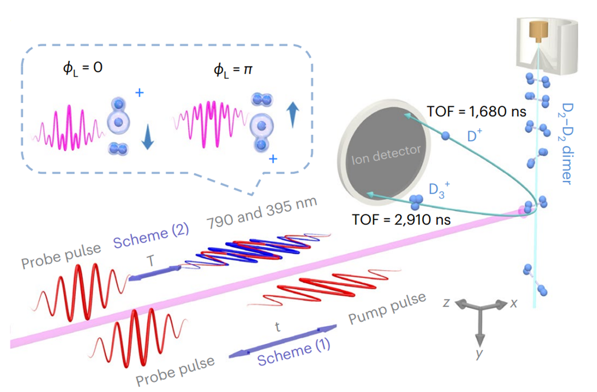 华东师大吴健教授团队近期在双分子光化学反应动力学时域观测与相干调控研究取得重要进展。该团队利用飞秒激光脉冲与D2-D2二聚体相互作用,成功测量了D3+的形成时间并实现了其出射方向的调控,揭示了自然界中最基本的分子-分子之间化学反应的内在机理。研究成果以“Ultrafast formation dynamics of D3+ from the light-driven bimolecular reaction of the D2-D2 dimer”为题,2023年6月1日发表在Nature Chemistry。