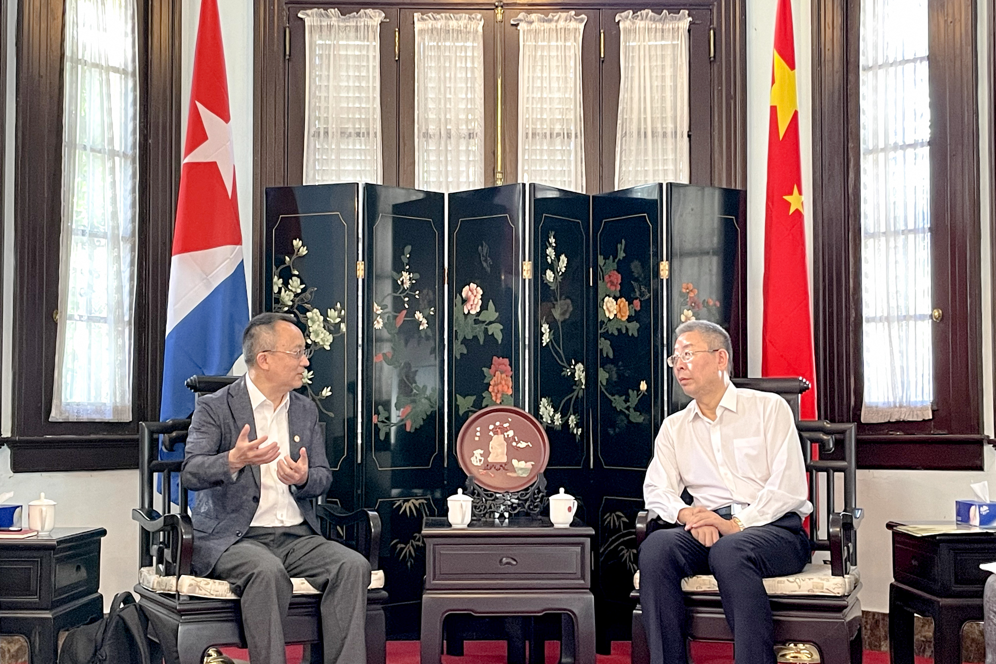 当地时间6月2日上午,代表团一行拜会中华人民共和国驻古巴大使馆,中华人民共和国驻古巴大使马辉、文化参赞韩立昕会见华东师大代表团。会上,雷启立副校长向马辉大使汇报了此次代表团访古成果。马辉大使表示,中古两国高校之间的交流合作是两国人文交流、民心沟通的重要组成部分,期待两国高校交流结出硕果。