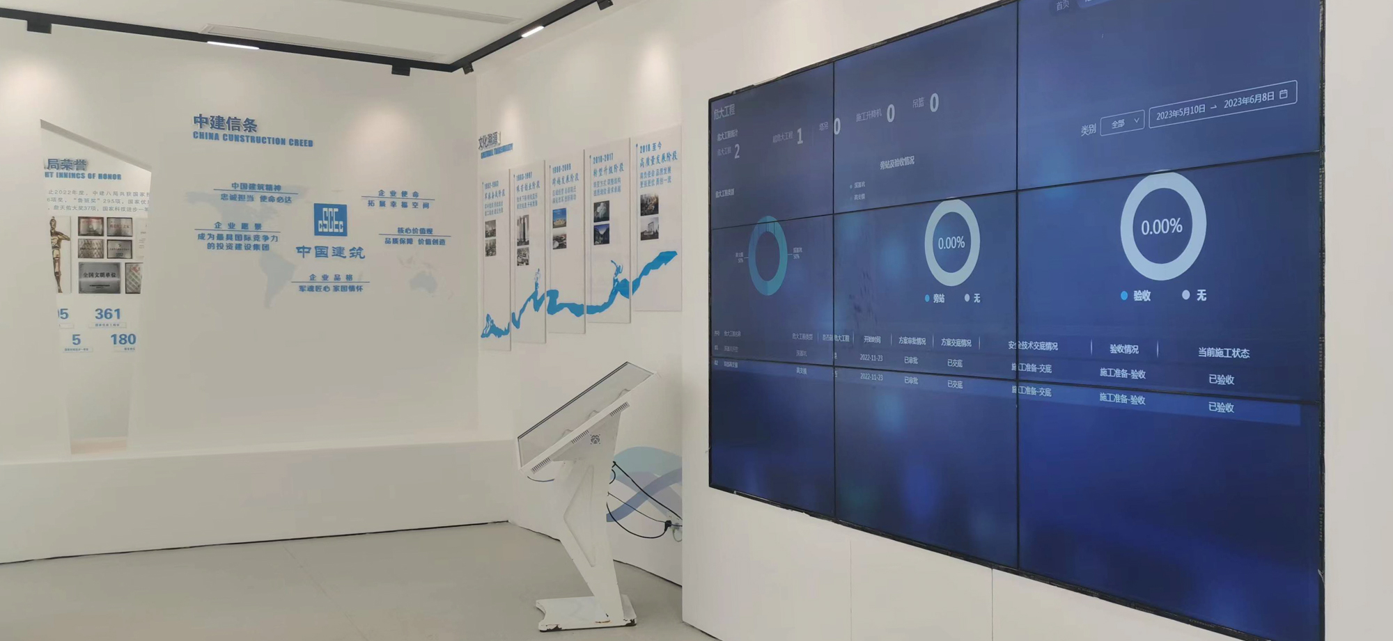 观摩区域共分4个展区:质量展区、安全展区、智慧展厅以及党建品牌展区。质量展区注重智慧建造,首创推行各类型机器人作业、智能化样板展示、绿色施工成果等;安全展区独立打造智慧工地实施运用模式,大型机械检到位信息检测体系、钢结构自升式操作平台、地下室自动排水装置、焊接机器人、火灾自动检测报警、吊钩吊装可视化、人脸智能识别实名制系统等;智慧展厅利用智慧平台实现危险源辨识、隐患检查整改、危大工程管控、人员教育培训一体化功能,实现隐患辨识整改透明化、及时性,同时通过统计重复隐患和重大隐患实时调整项目安全管理重点。