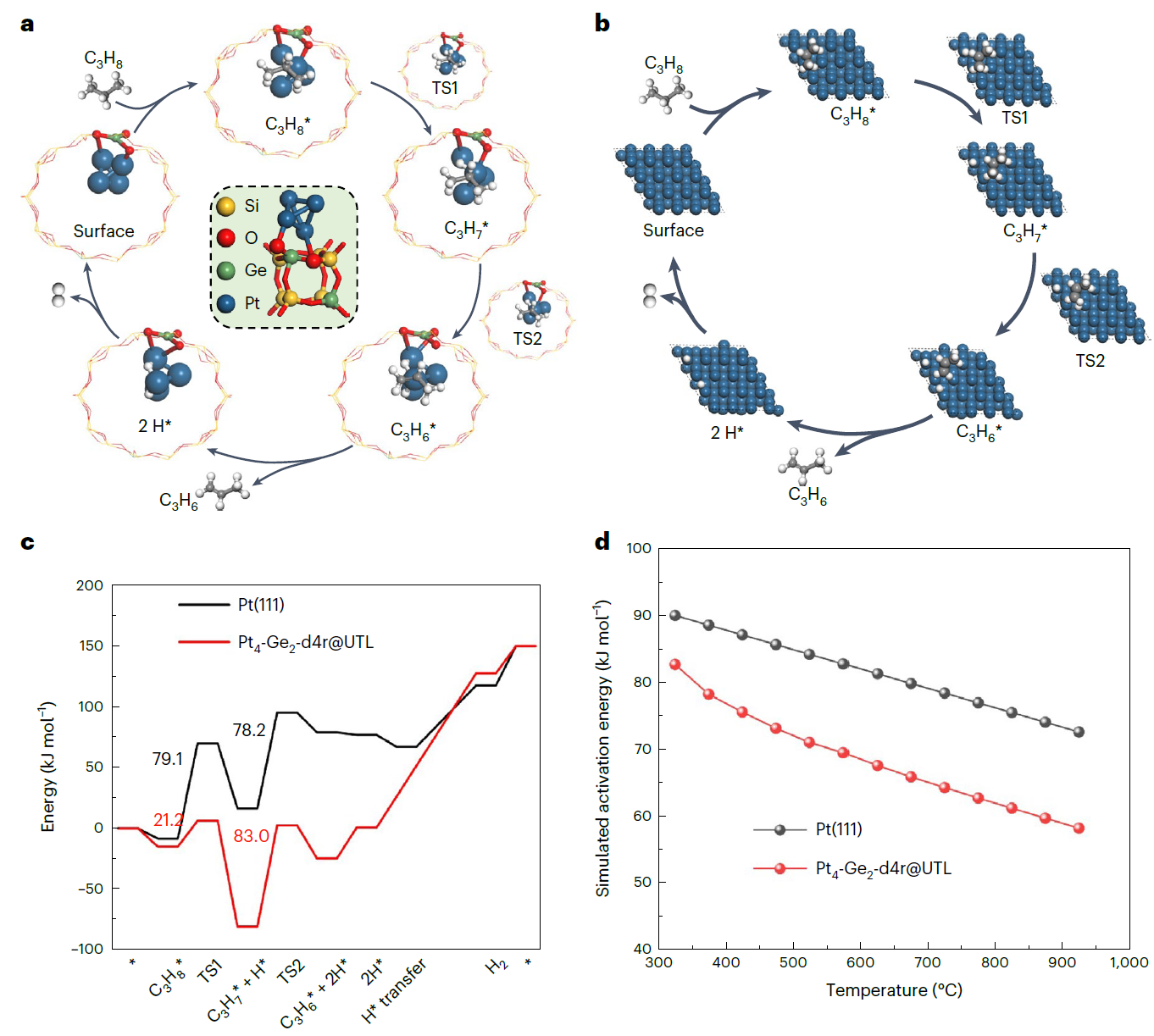 DFT理论计算和微观动力学模拟结果表明Pt4-Ge2-d4r@UTL结构的计算活化能接近实验值,且远低于Pt(111)的活化能。这归因于Pt4-Ge2-d4r@UTL结构可以有效降低第一步脱氢的能垒,这是整个PDH反应的速率决定步骤,从而提高丙烷脱氢反应速率。