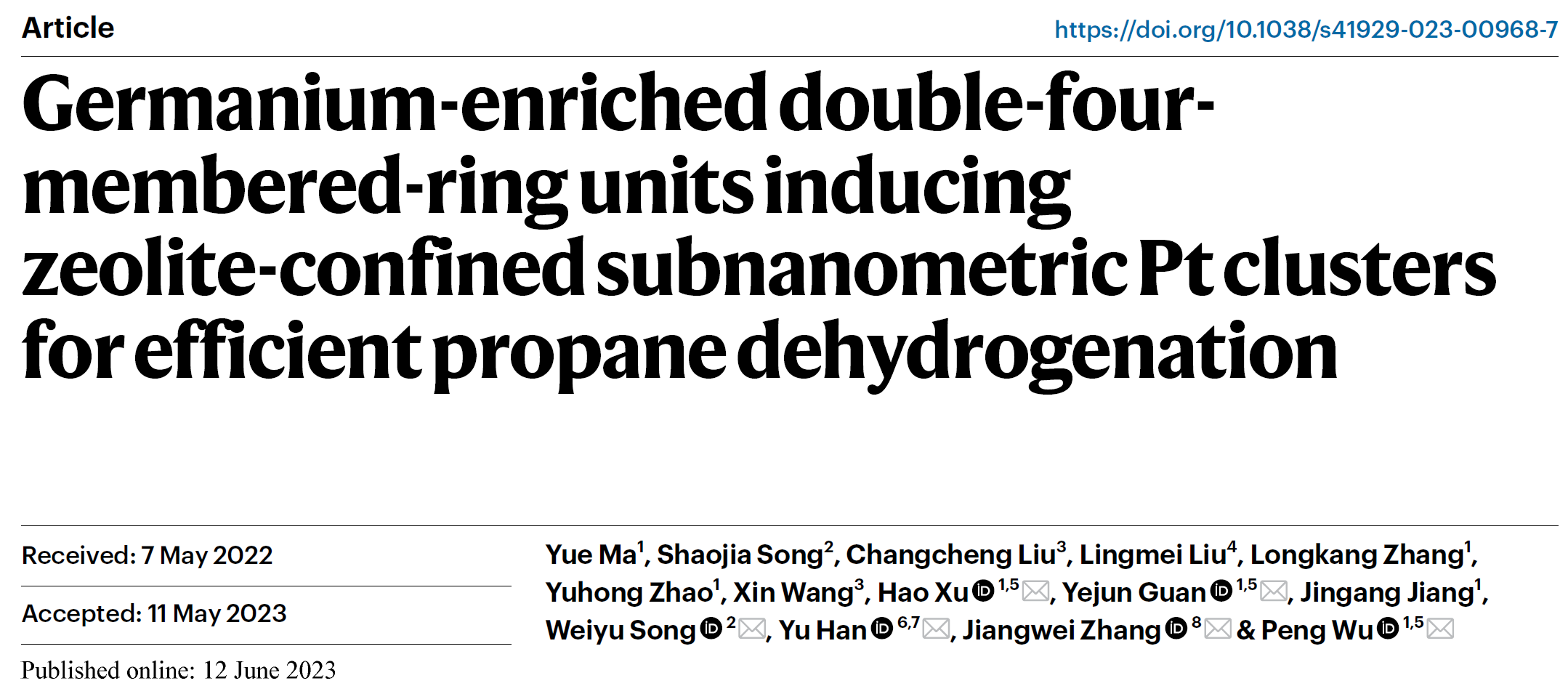 近日,万象城awcsport官网化学与分子工程学院吴鹏教授团队在分子筛孔道限域金属催化剂高效催化丙烷脱氢领域取得重要进展。面向丙烷脱氢制丙烯这一重要工业反应对高活性、高选择性和高稳定性贵金属催化剂的实际需求,课题组创制了超大微孔硅锗沸石孔道内限域锚定铂(Pt)团簇催化剂,利用沸石骨架金属与Pt的强相互作用,实现了丙烷脱氢高选择性制丙烯反应的长周期运行。2023年6月12日,研究成果以《Germanium-enriched double-four membered-ring units inducing zeolite-confined subnanometric Pt clusters for efficient propane dehydrogenation》为题在线发表于Nature Catalysis上。