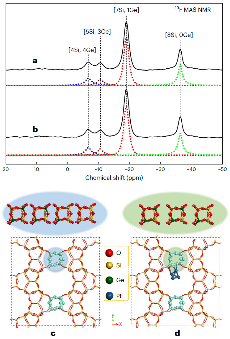 课题组利用积分差分相位衬度成像扫描透射电子显微镜,证实了亚纳米级的Pt团簇特异性地落位在UTL的14元环孔道内,表明Pt在UTL孔道中占据了特定位置,这与14元环孔道具有较大孔尺寸以及骨架Ge在双四元环结构单元的局部富集有关。