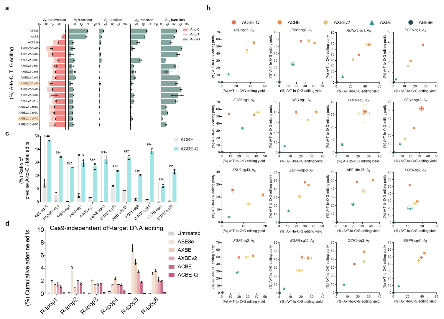 经过大量内源性靶点评价以及体外酶活实验发现AXBE具有YA*R (R=A或G)碱基背景序列(motif)的偏好性。在含有YAR motif的靶点中,AXBE可产生15-32%的A到Y碱基颠换编辑。AXBE在HeLa细胞系中也可达到高达46%的腺嘌呤碱基颠换。通过Cas9依赖性/非依赖性DNA水平脱靶评估以及转录组水平脱靶检测发现,相比于ABE系统,AXBE的脱靶明显降低,尤其是在RNA水平上降低了90%。