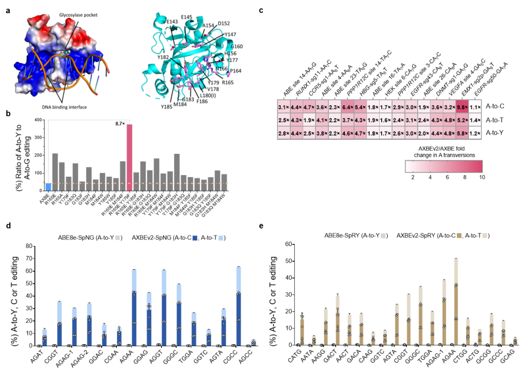 为增加腺嘌呤颠换编辑效率并拓展靶向范围,基于结构导向的理性设计和筛选鉴定出mAAG中的两个关键突变(mAAG-EF)极大提高对其底物肌苷切除的活性,基于此产生的AXBEv2介导更高效的A到Y编辑,甚至在非YAR-motif位点的颠换突变也显著提升,因此有效改善了颠换编辑的序列背景选择性。此外,mAAG-EF也可以兼容PAM识别更广的其他Cas9变体(如spNG, spRY),表明了可以广泛地靶向基因组,扩大应用范围。