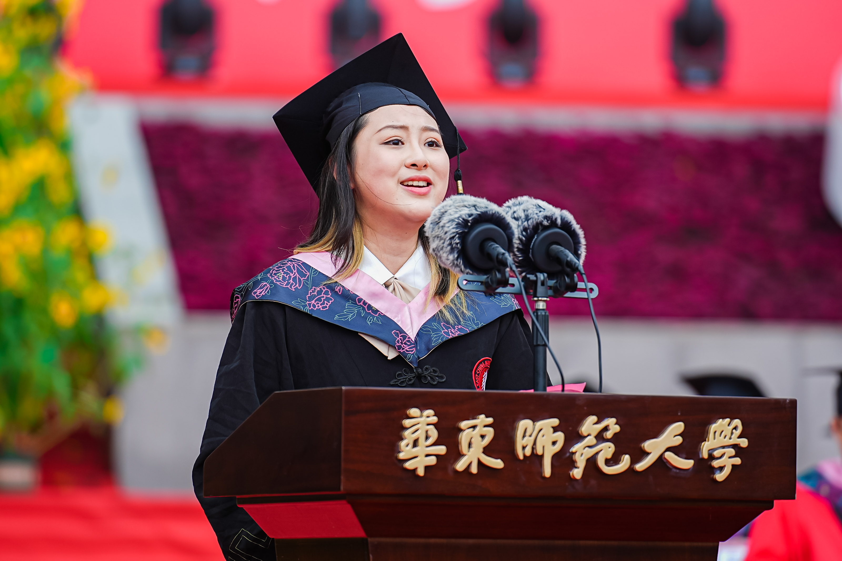 外语学院毕业生黎氏水银作为国际学生代表,分享了她在华东师大的留学经历。她本来已在越南河内外贸大学就读,因为渴望拥抱更大世界而来华东师大求学。她积极参加学校各种活动和比赛,获得不少奖项,当上了国际学生联合会副主席,成为国际学生宣传大使。她在社交媒体上记录自己的留学见闻,成为一名传播华东师大文化和校园生活的知名博主,观看人数累计60多万。学习之余,她还加入华为越南公司进行实习。她说,“到华东师大读书,改变了我的人生,千言万语也表达不出我对母校和老师的感激之情。”