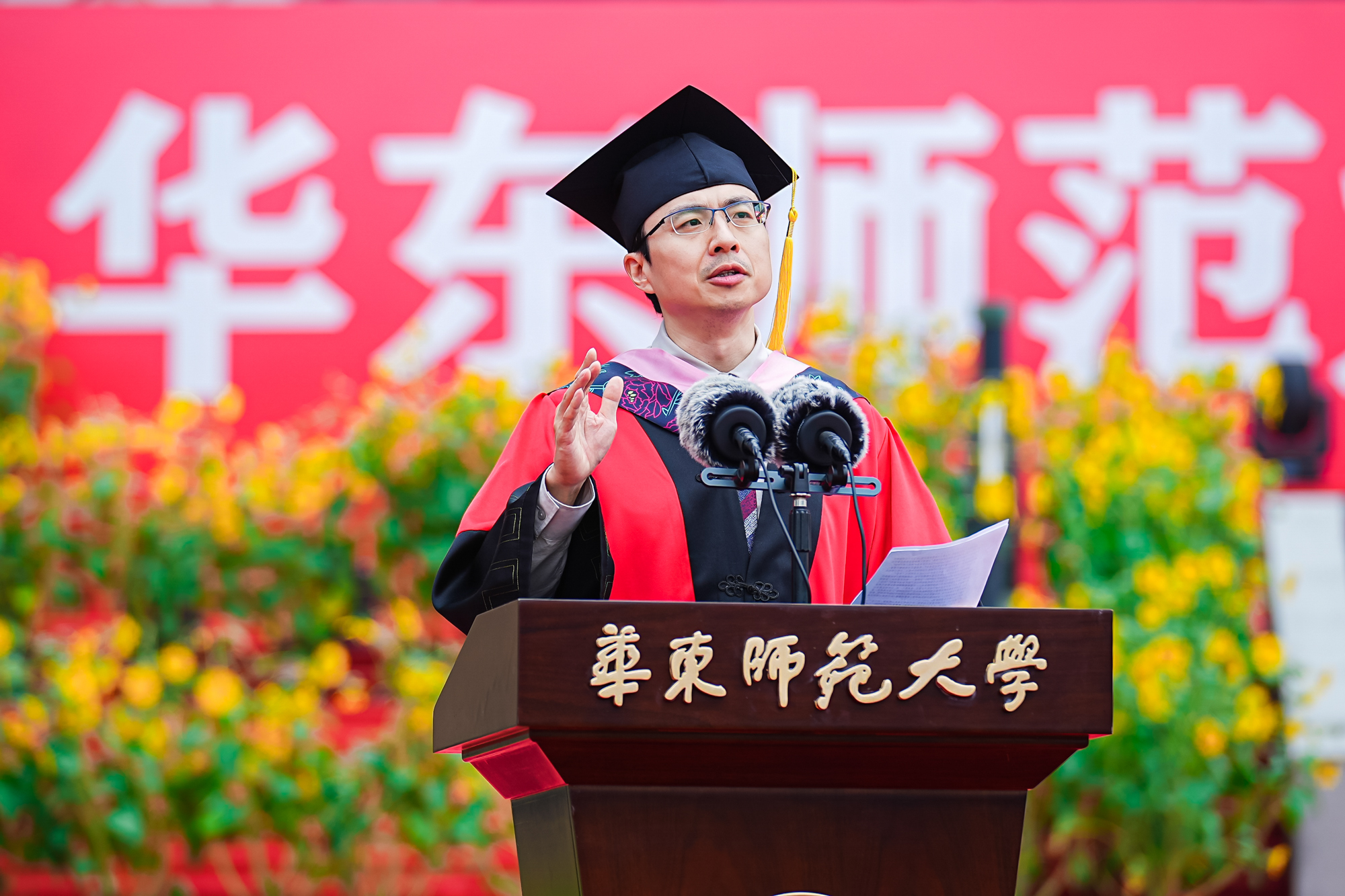 万象城awcsport官网2023届毕业典礼上,政治与国际关系学院院长吴冠军教授作为教师代表,在致辞中对华东师大毕业生寄予厚望,希望他们“展翅腾飞,在未来岁月中实现潜能、绽放生命”。他指出,走出学校的校门,绝不是挥别学习的生涯。面对GPT时代的挑战,他建议同学们要做量子思维的使用者。他说,“在人工智能时代依然追求卓越的人、不放弃学习甚至终身学习的人,就是华东师大要培养的人。”