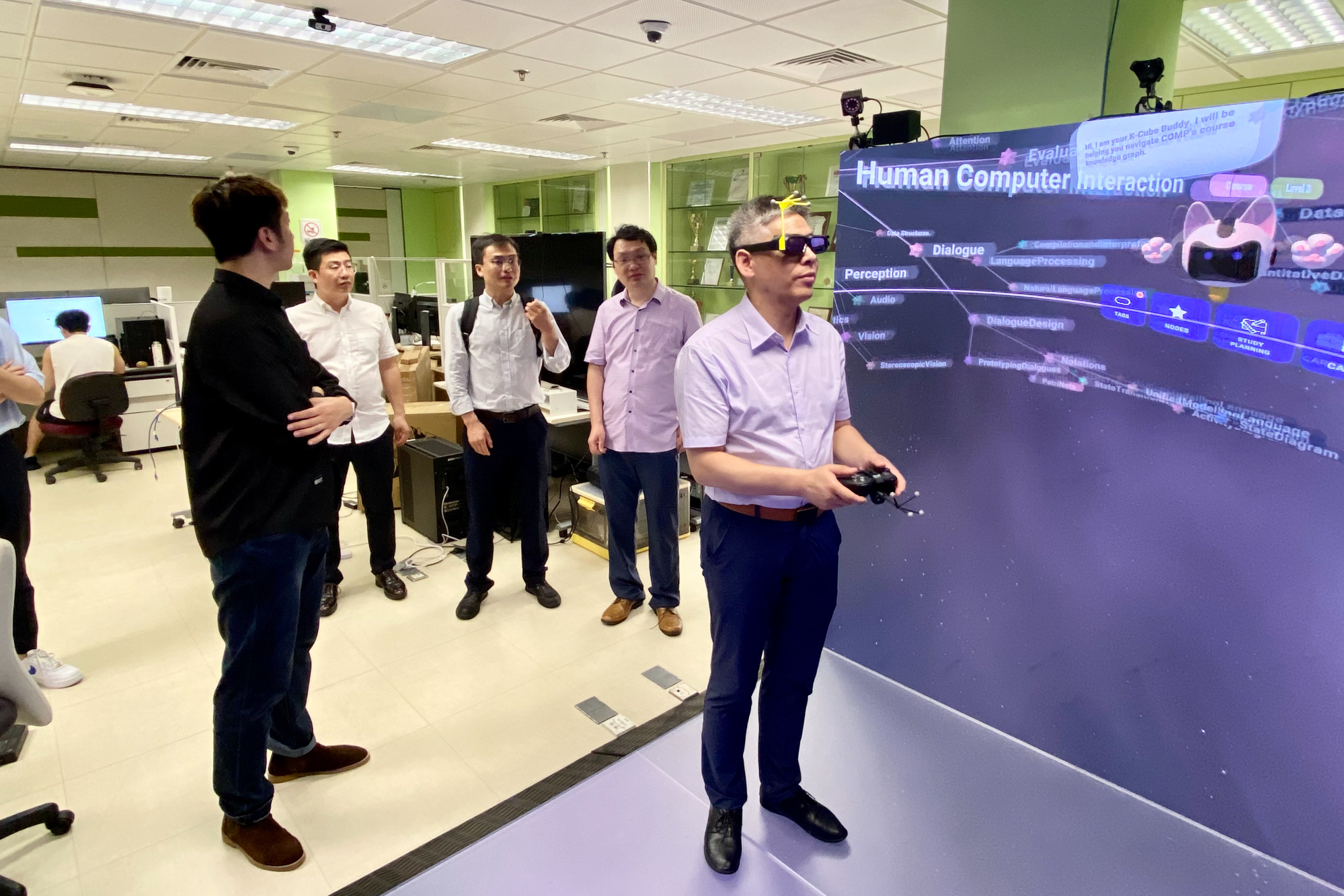 代表团一行还到访了香港理工大学,走访了该校电子计算学系和设计学院,并参观了人工智能与数据科学研究中心。该校电子计算学系助理教授李平介绍了团队在元宇宙领域的研究成果,双方就沉浸式虚拟现实技术在老年人群的康复治疗和虚拟课堂等方面的应用展开了探讨。