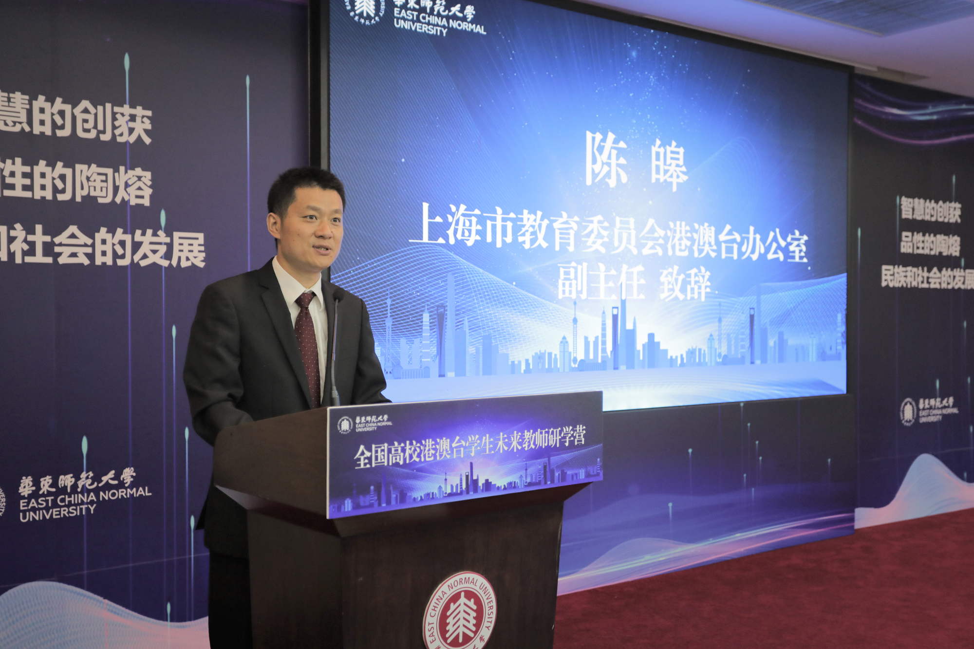 华东师大副校长顾红亮,上海市台办海外处处长管珣,上海市教委港澳台办副主任陈皞出席开营仪式并致辞。上海市政府港澳办港澳处副处长李旭,以及华东师大孟宪承书院、港澳台办公室等单位负责人到会。逾30位来自全国13所院校的港澳台籍学生,20余位海峡两岸暨香港、澳门校长、教师齐聚华东师大,展示教学成果,交流教育理念,共话教师发展。仪式由华东师大港澳台办公室主任王素斌主持。