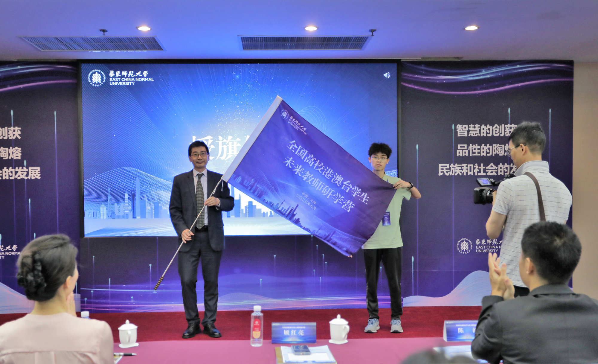 随后,顾红亮向研学营学生代表、来自澳门的张家豪同学授予营旗,并宣布首届全国高校港澳台学生未来教师研学营开营。