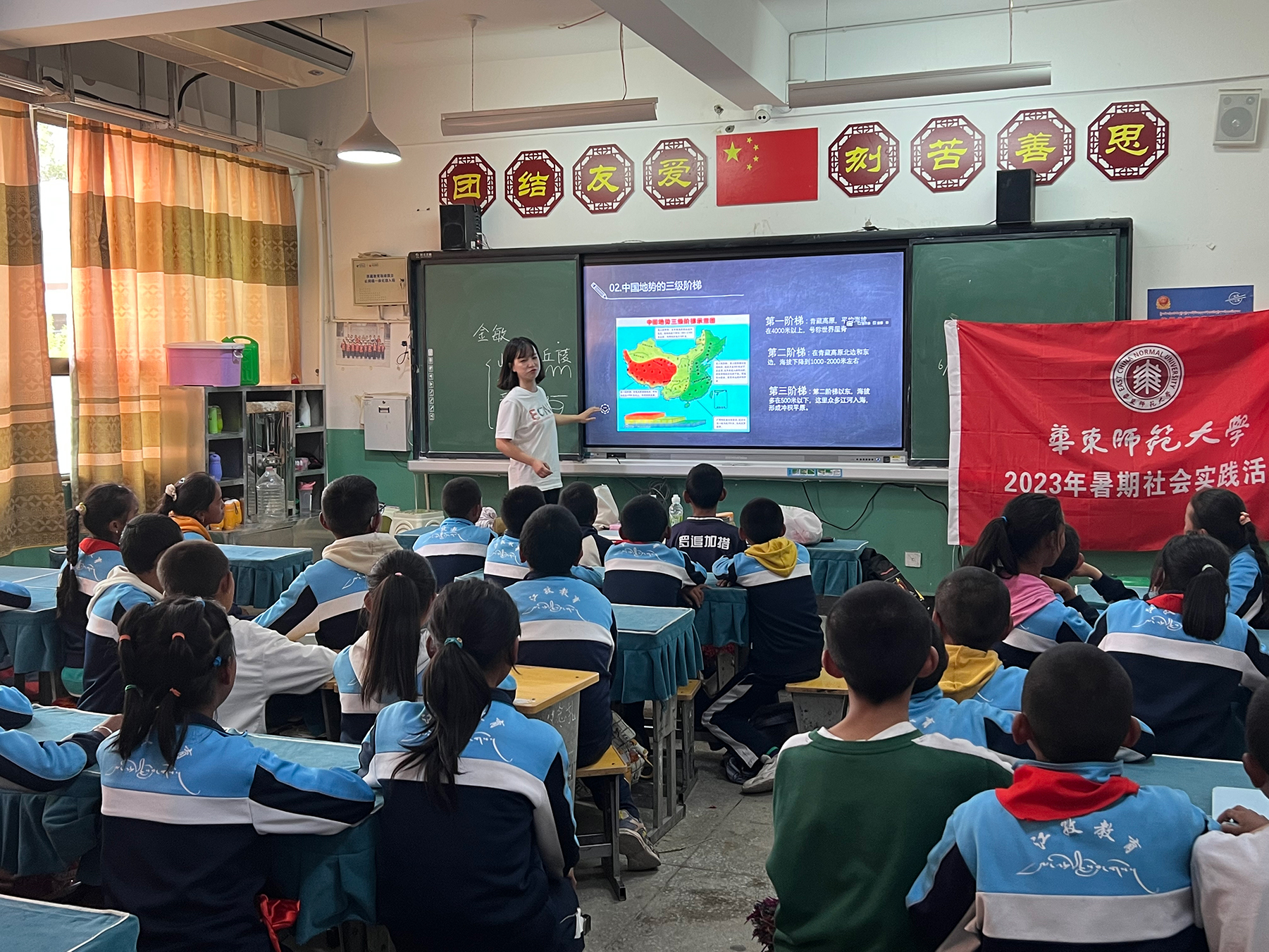 历时三天,长途跋涉超过60小时,支教队员们终于抵达两所乡里的小学。简短的物资交接仪式后,支教正式开始。学校此时已临近期末,怎样才能让孩子们既保持学习动力又保持放松心态呢?经过行前多次讨论,队员们最终决定针对不同年级,开展形式多样的以梦想、党史、音乐、电影、手工为主题的班会课。