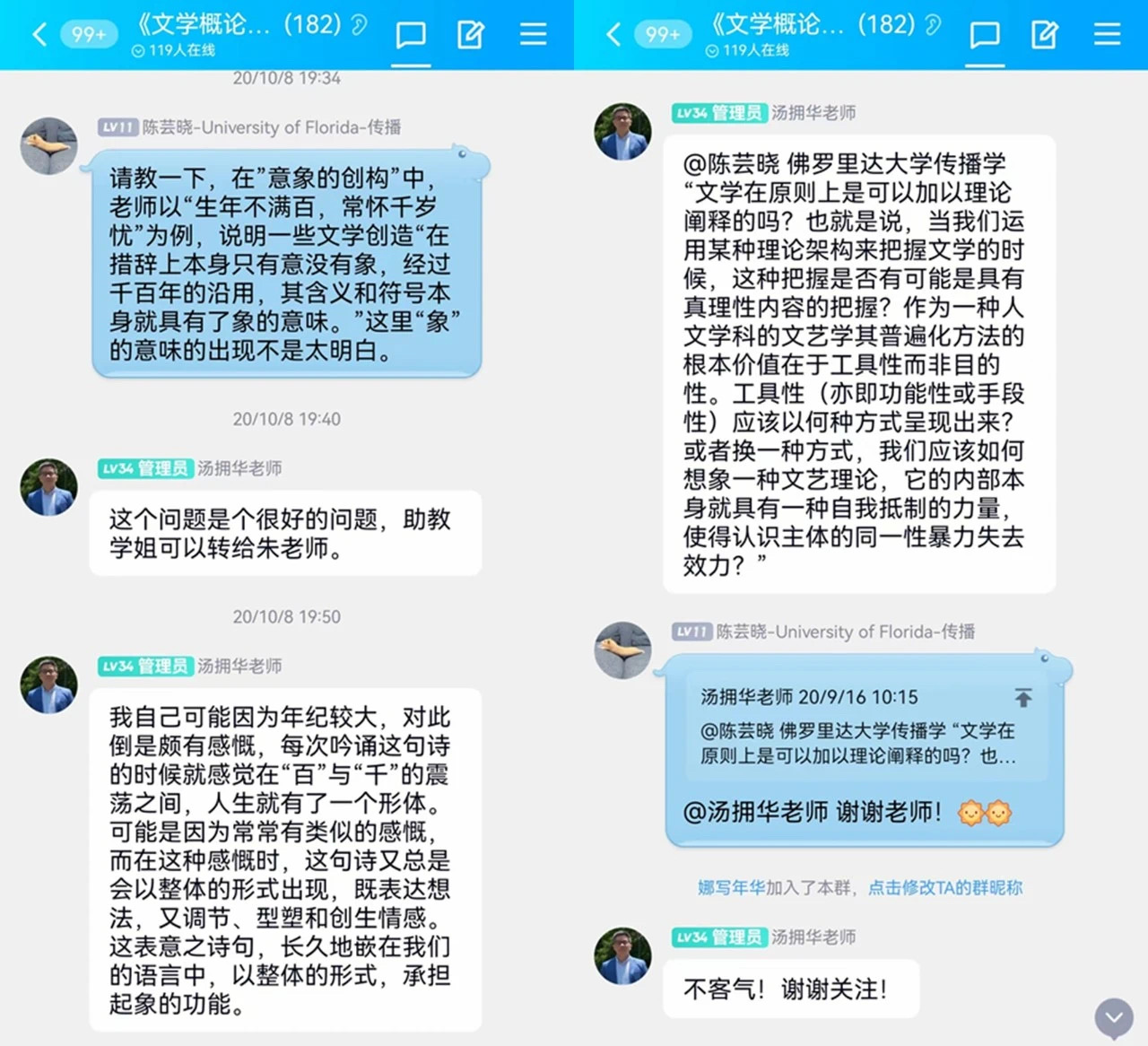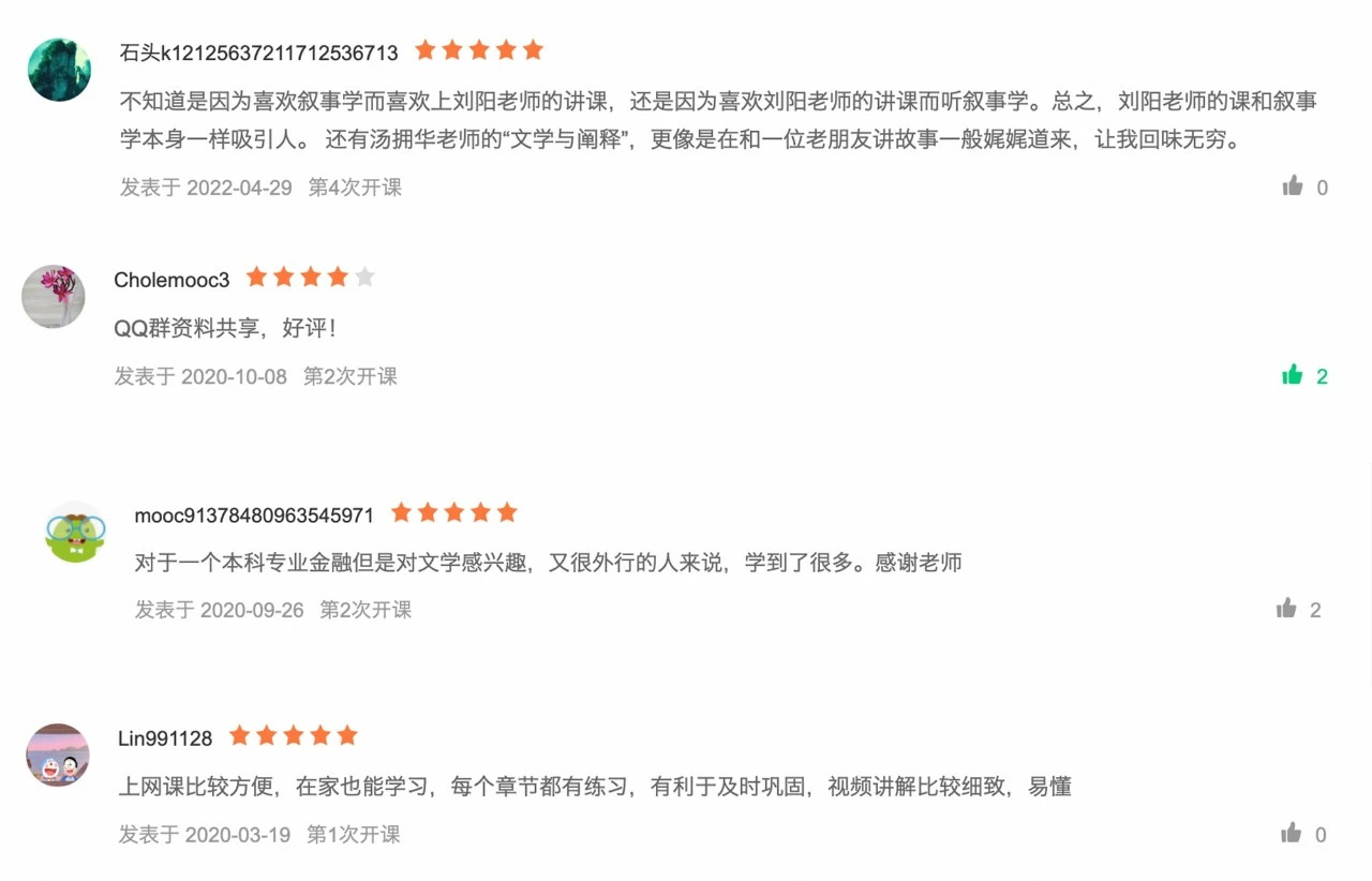 “每位老师的逻辑非常严密,没有一句多余的话,真的很赞。”“不知道是因为喜欢叙事学而喜欢上刘阳老师的讲课,还是因为喜欢刘阳老师的讲课而听叙事学。总之,刘阳老师的课和叙事学本身一样吸引人。”“汤拥华老师的‘文学与阐释’,更像是在和一位老朋友讲故事一般娓娓道来,让我回味无穷。”“从学术角度看《西游记》作品的诞生,让我获得了新知,对作品的理解也达到了新的高度。”