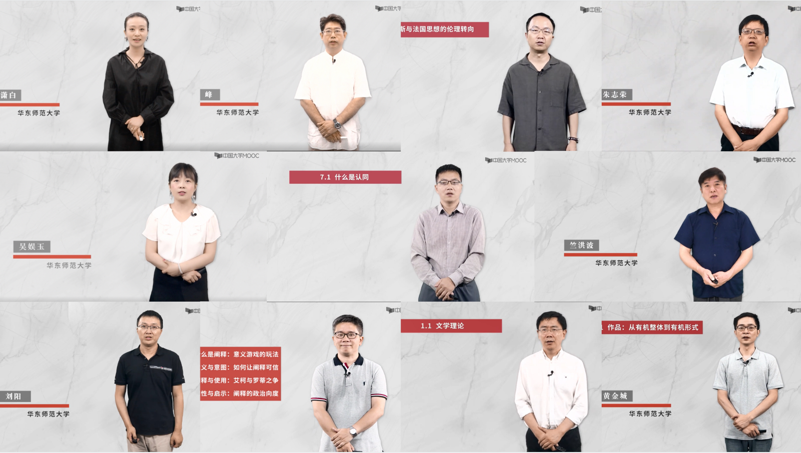 “这门课之所以由11位教师组成,是希望能够提供真正体现前沿导向的高质量文艺理论课程,展现华东师大文艺理论研究的实力。”朱国华介绍说,“其他文艺理论类的慕课,可能不像我们这样,基本上是整个教研室全员出动。”课程团队成员从60后到70后、80后,都具有高级职称,其中多位教授入选国家级高层次人才计划,在学界颇有影响力,整体实力在国内稳居前列。