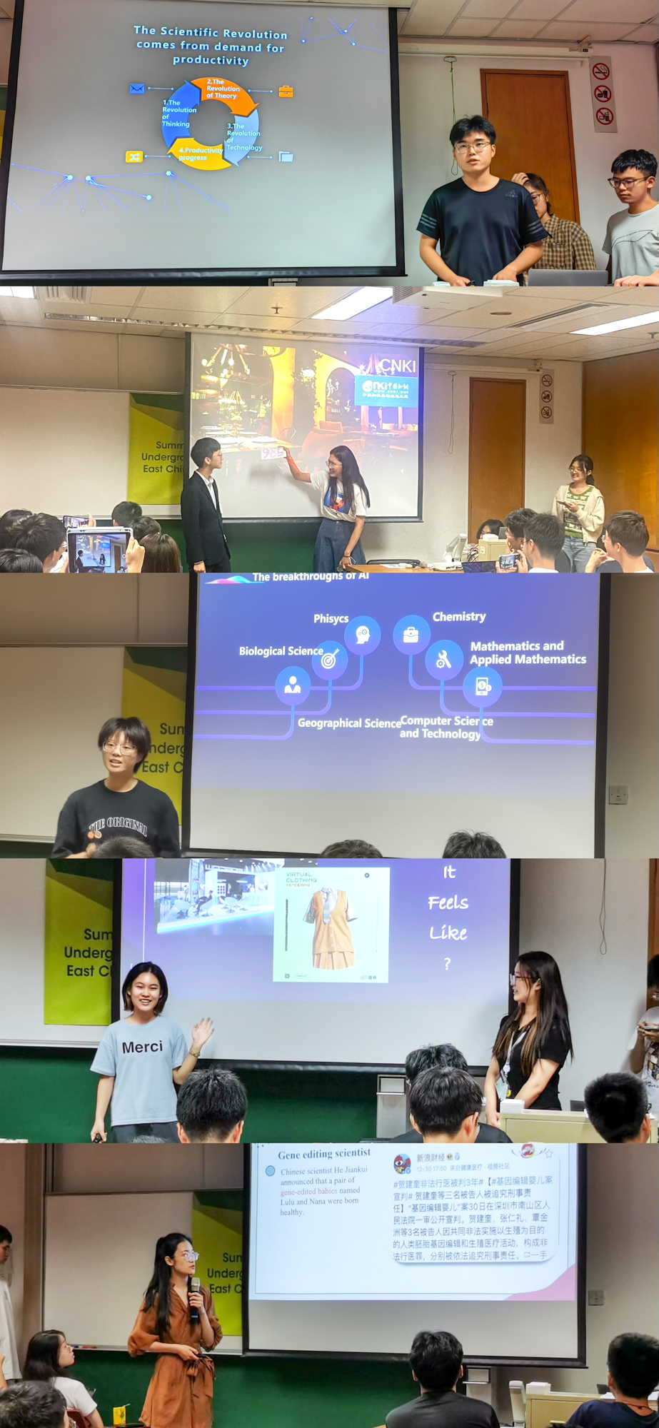 项目最后一天,5组学员进行全英文项目研究展示,项目主题、所涉学科领域各不相同:基于Kuhn Cycle对四个学科科学革命进行系统分析;采用情景喜剧演绎大数据干预下的相亲场景,以分析科学到人文的定量思维;聚焦人工智能,讨论是乌托邦还是反乌托邦;聚焦近来热点话题“元宇宙”,讨论对于人类科学发展是骗局还是机遇;引用不同学科的案例讨论科学与技术中的伦理问题。