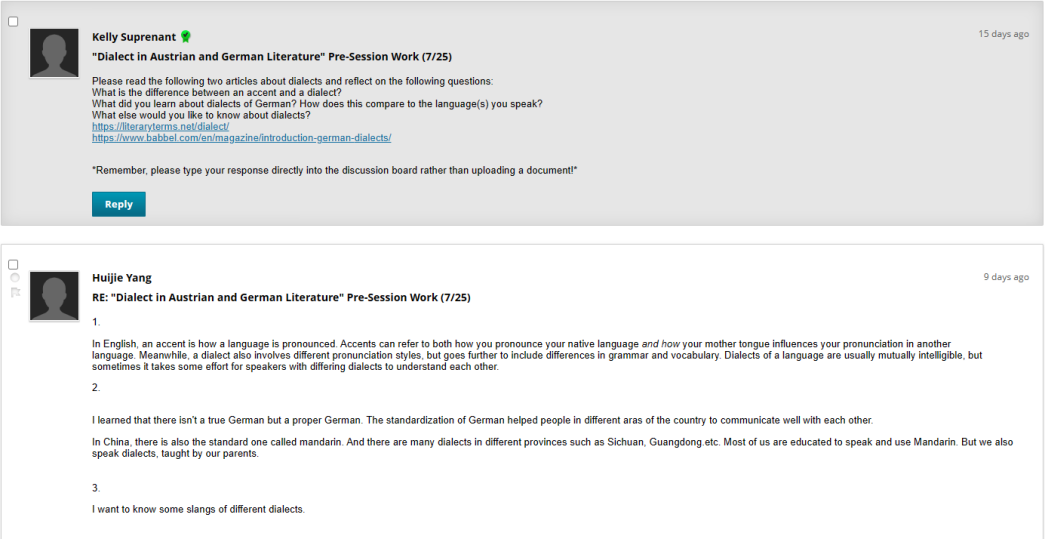为达到更好的教学效果,课前,康大教授们会在HuskyCT布置一些课前学习任务,包括搜集资料、小组讨论、阅读文献、填写问卷等,同学们需要提前完成并通过Discussion Board展示预习进度,分享学习心得和资源,从而有效提升小组合作能力与学术探究能力。