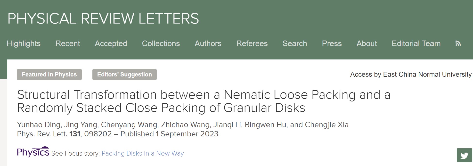 相关研究以“Structural Transformation between a Nematic Loose Packing and a Randomly Stacked Close Packing of Granular Disks”为题,于9月1日发表在《物理评论快报》(Physical Review Letters),被选为“编辑推荐”,并被美国物理学会 Physics 网页以 Focus 形式在主页推荐报道(https://physics.aps.org/articles/v16/150)。论文第一作者为万象城awcsport官网20级硕士研究生丁匀皓(现已赴英国留学深造),胡炳文和李建奇老师参与研究。该研究得到了国家自然科学基金青年科学基金等项目资助。