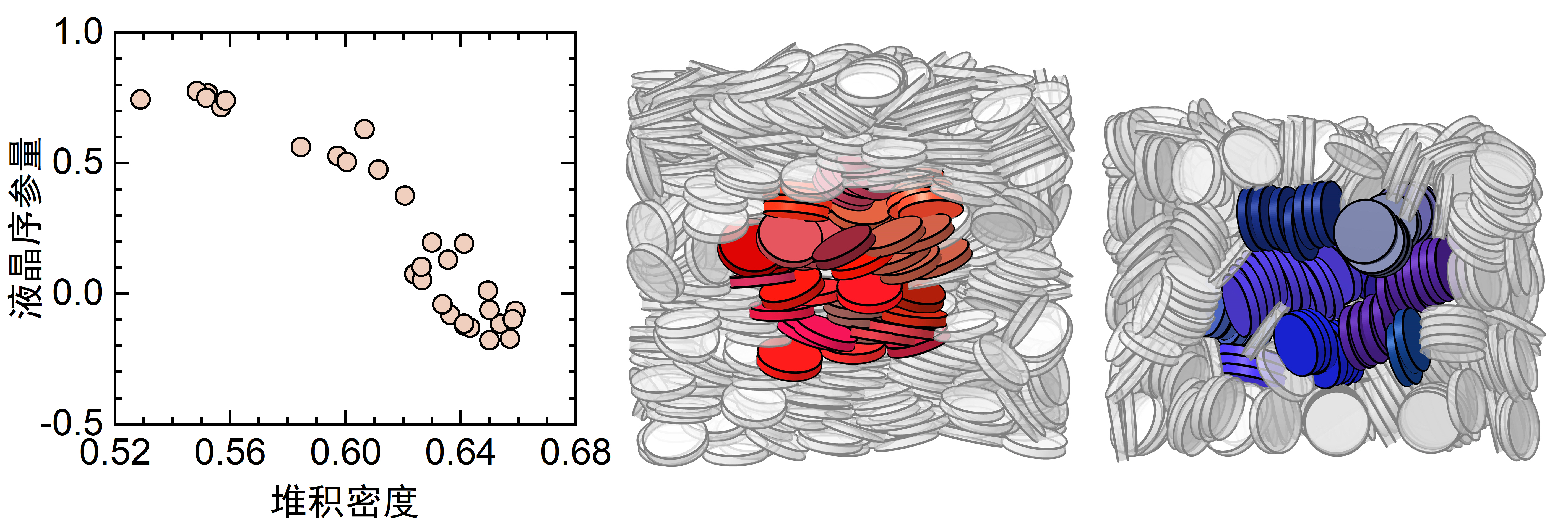 图1:碟状颗粒堆积液晶序参量随堆积密度增加而减小。稀疏堆积中,粒子零散排布,整体取向沿竖直方向;致密堆积中,粒子形成堆叠,整体取向无序。