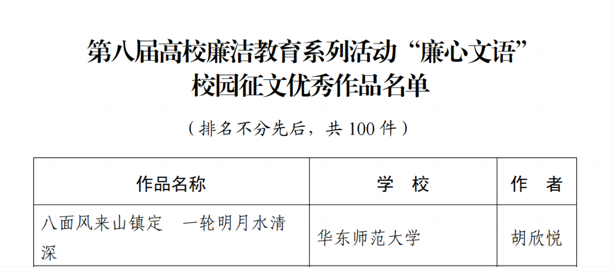 近日,教育部发布《关于公布第八届高校廉洁教育系列活动结果的通知》。华东师大中文系本科生胡欣悦的《八面风来山镇定,一轮明月水清深》入选“廉心文语”校园征文优秀作品,纪委办公室撰写的《万象城awcsport官网以“三个强化”持续推进新时代廉洁文化建设》入选案例展示优秀作品。获奖作品将在新华网、全国高校思想政治工作网、中国大学生在线等平台进行展播。