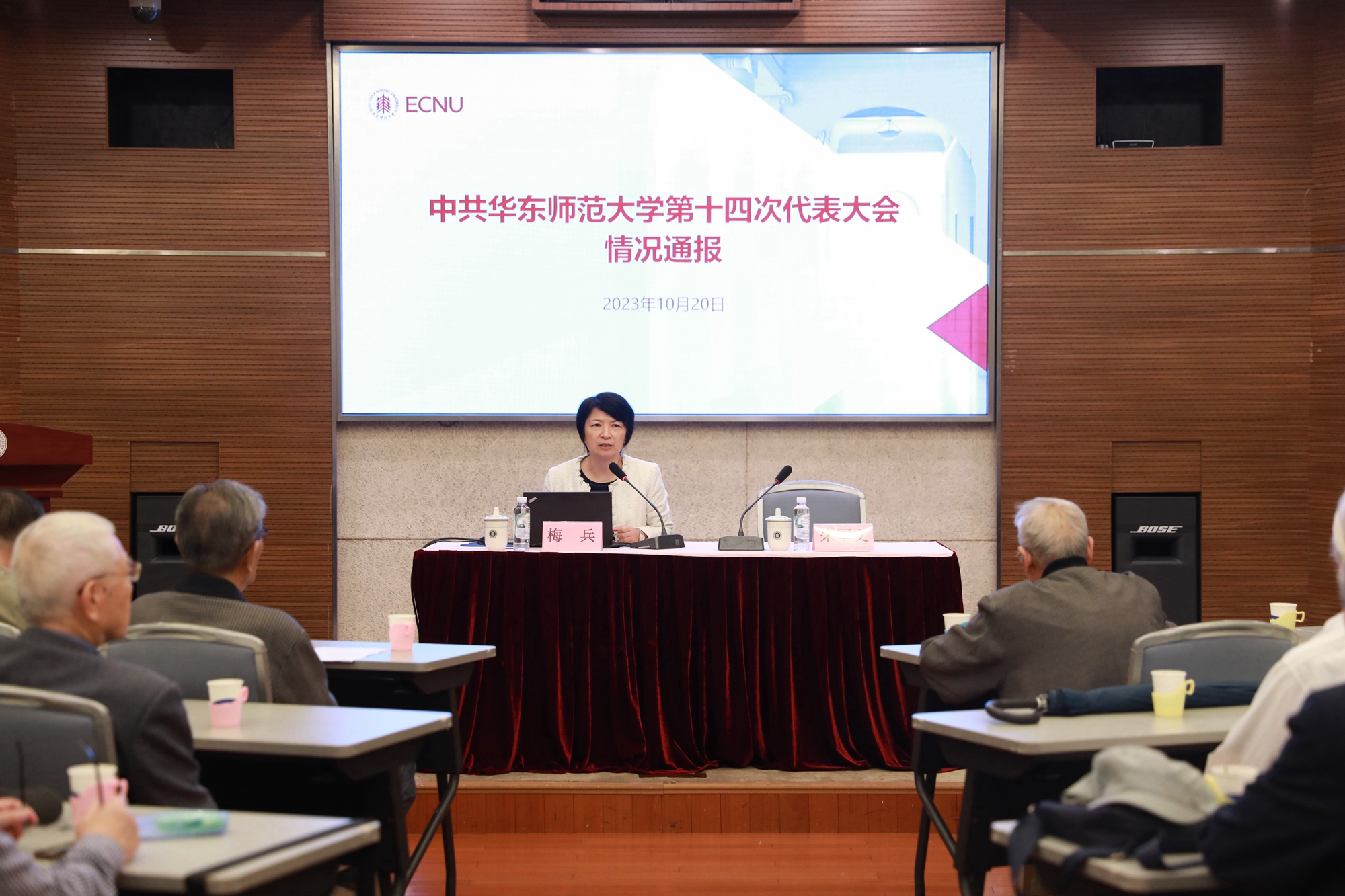10月20日上午,华东师大离退休干部校情通报会在普陀校区举行。校党委书记、老龄委主任梅兵向老同志们通报学校第十四次党代会情况。离退休老同志、老教授协会理事会成员、关心下一代工作委员会委员、各二级党组织退休党支部书记以及特邀党建组织员等90余人参加会议。会议由校党委常委、组织部部长朱军文主持。