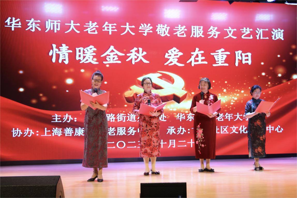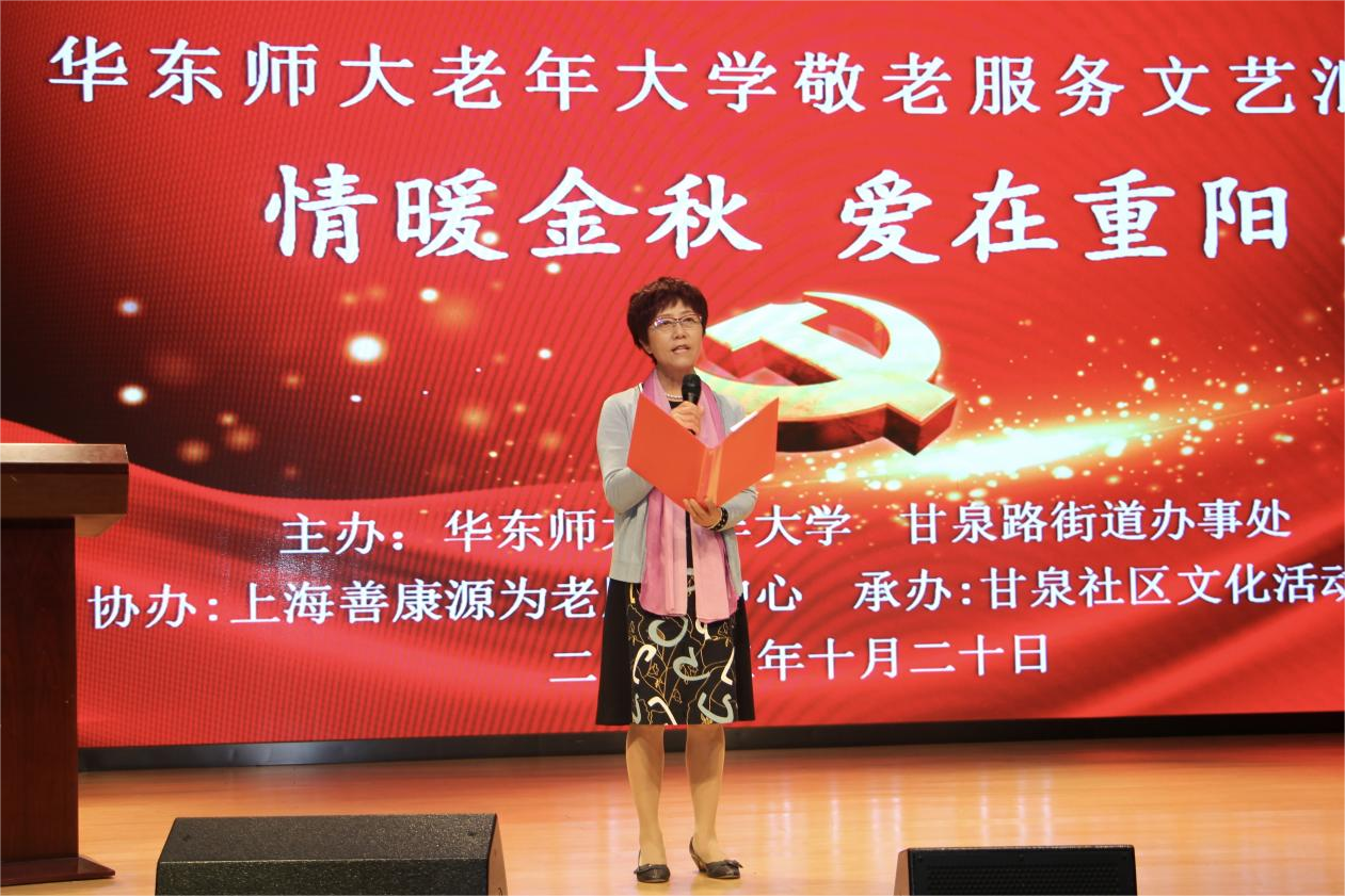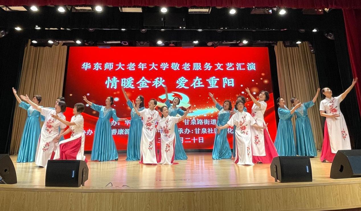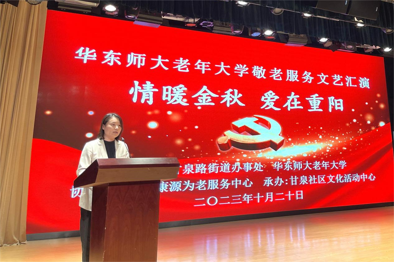 金秋十月,丹桂飘香。10月20日下午,在重阳节来临之际,华东师大老年大学组织师生志愿服务队赴普陀区甘泉街道社区文化活动中心,开展敬老服务进社区文艺汇演。甘泉路街道办事处副主任顾旻娜、华东师大老年大学常务副校长裴建华、甘泉社区服务办主任施明浩、上海善康源为老服务中心负责人毛建农以及甘泉社区居民200余人出席并观看演出。
