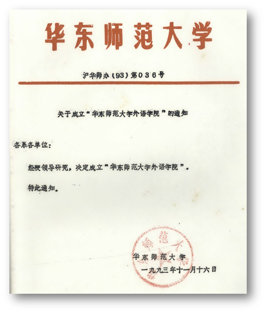 1951年华东师大成立后,即成立外文系,设英语、俄语专业。此后,学校响应国家需求,几经变更系所设置,于1993年10月正式成立外语学院。