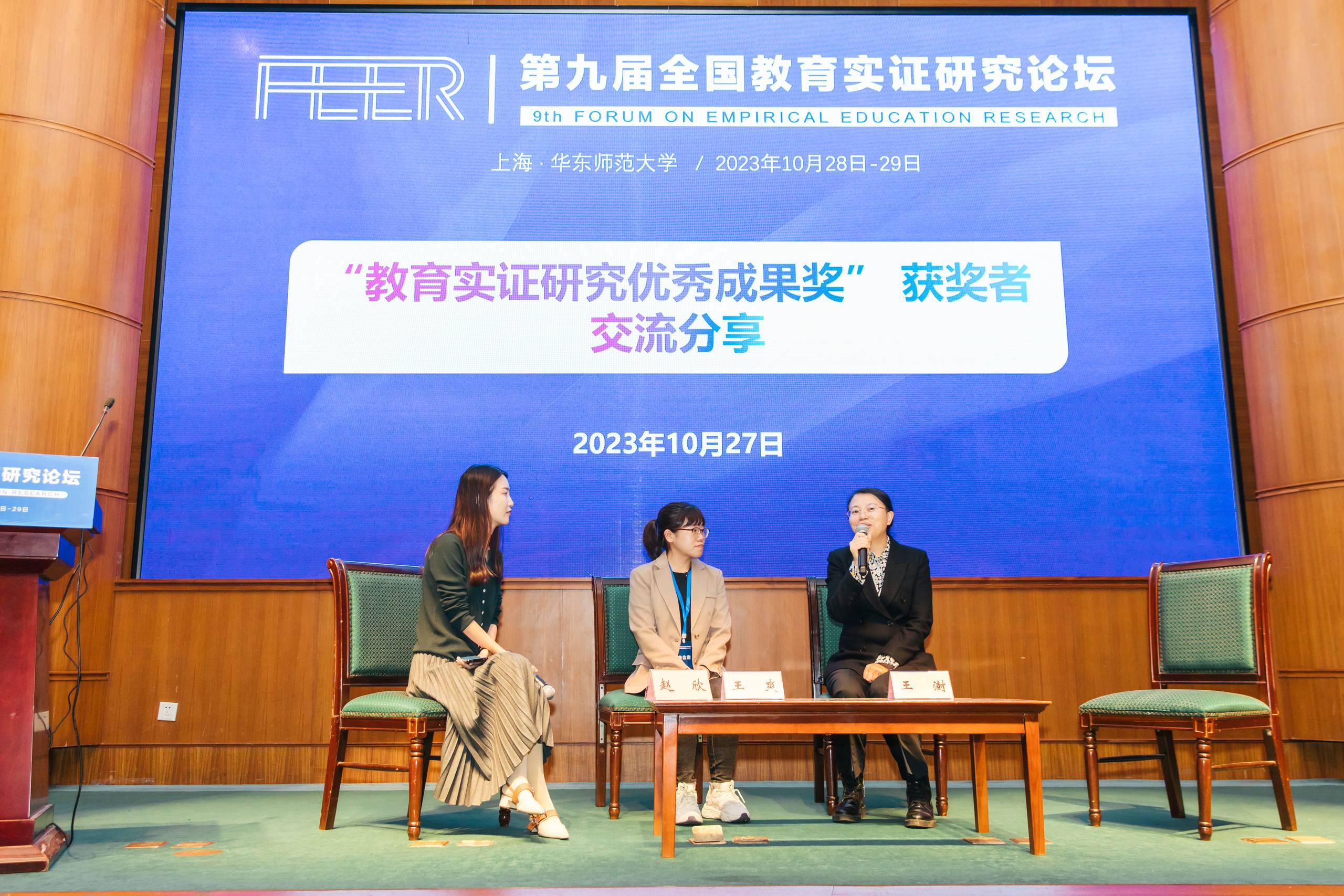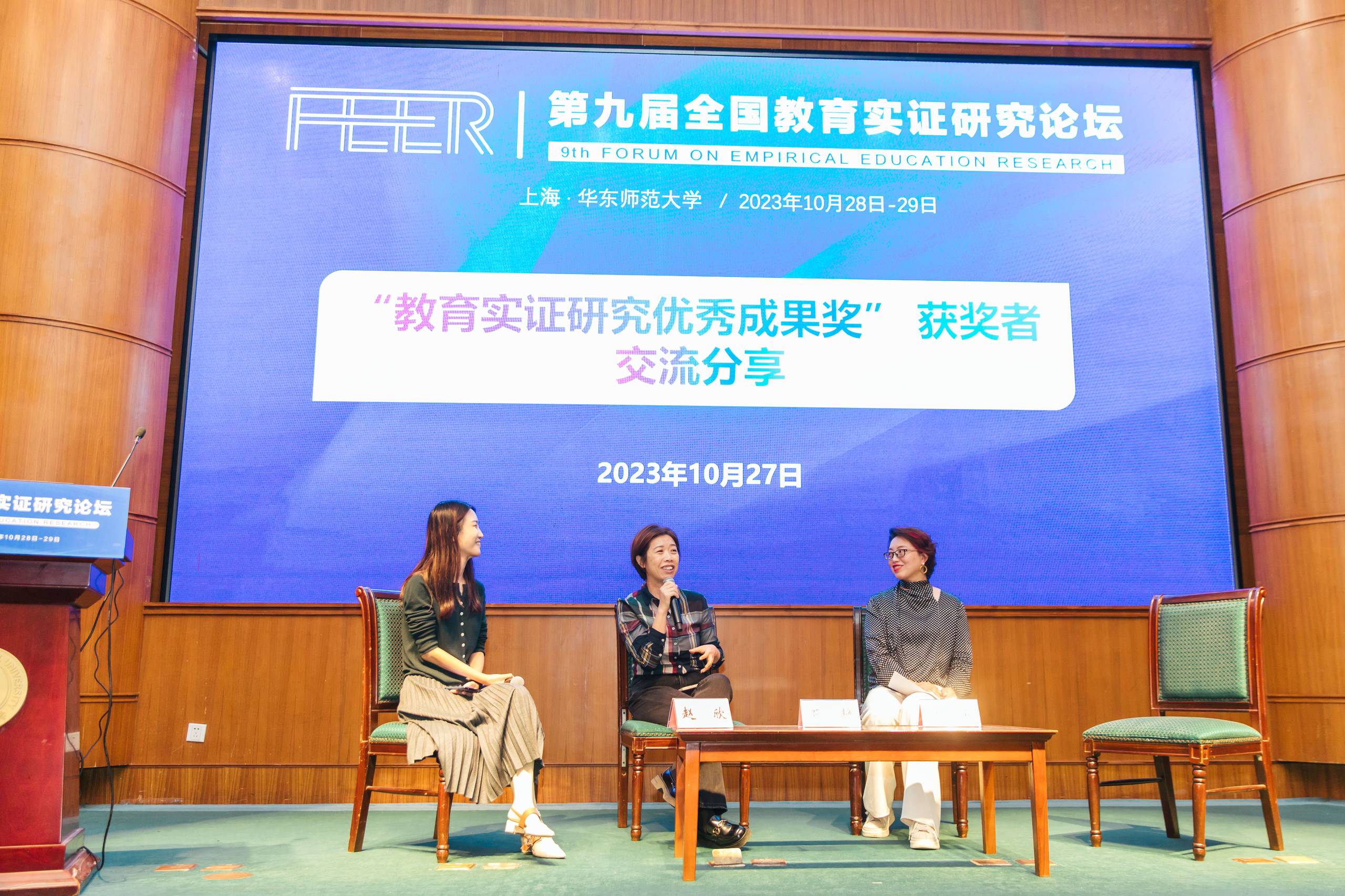 作为本次论坛的第一项特色活动,也是第九届全国教育实证研究论坛的暖场特别活动,主办方于10月27日晚举行了第六届、第七届“教育实证研究优秀成果奖”获奖者现场交流分享会,请获奖论文作者代表及其推荐机构的嘉宾老师一起对谈,畅谈好的研究是怎样做出来的以及那些优秀论文写作背后的故事。在这场轻松愉悦的活动中,既有获奖者与推荐单位代表之间的分享,也有往届获奖者代表之间的交流共话。